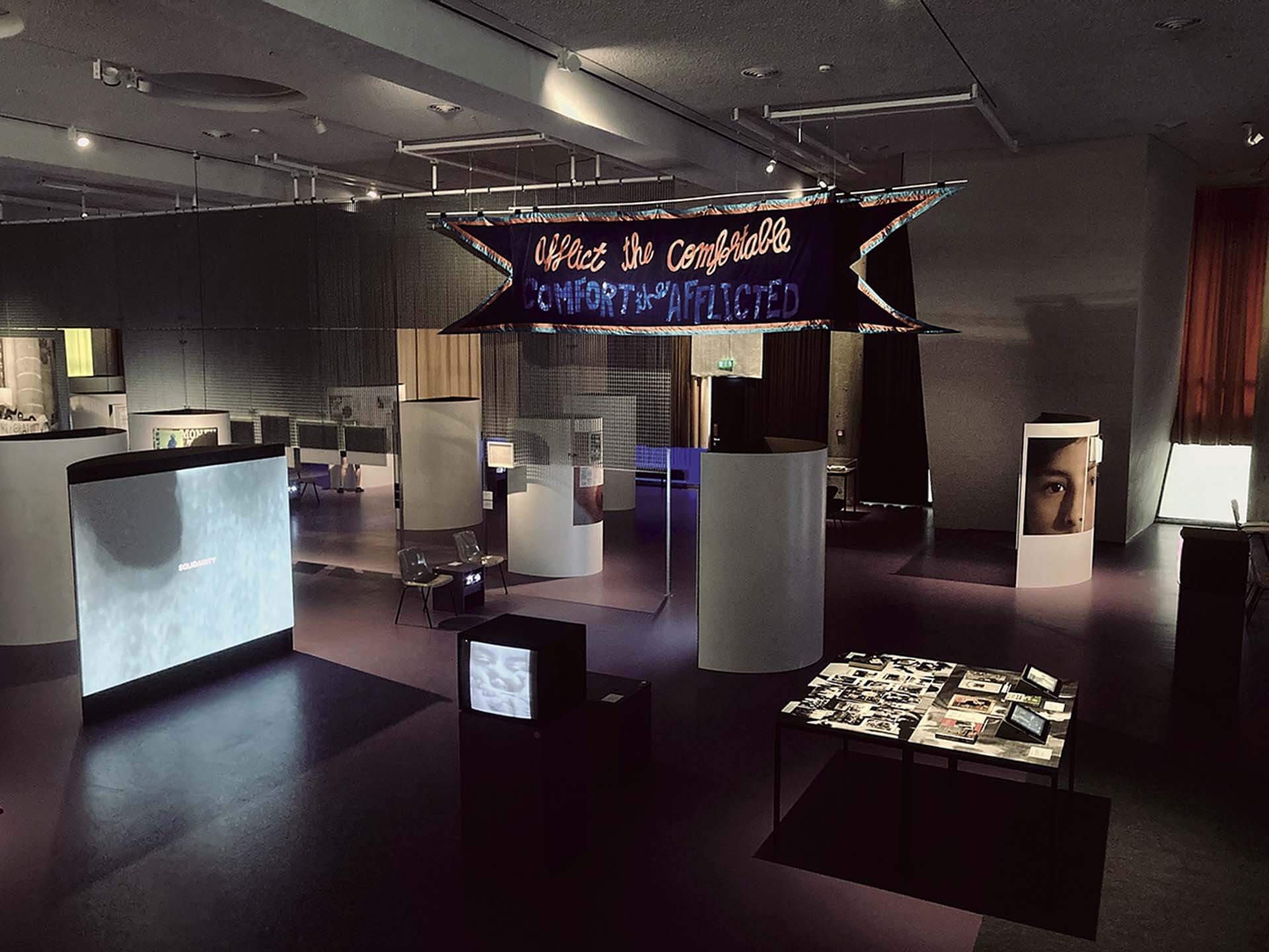 特別是聲音的呈現上,策展團隊做了個大膽且正確的決定:上百件作品、近50個大小銀幕/螢幕中,只有一件作品是擴音播放的——黎巴嫩-巴勒斯坦裔藝術家莫娜.哈透姆(Mona Hatoum)的錄像《So Much I Want To Say》。這得歸功於HKW設計精良的觀眾個人設備,入場的觀眾都會手持一臺連接著耳機的電子設備,將感應器對準想觀看的影片,耳機即會播放該影片的聲音。如此一來,展間裡的影像作品聲音就不會互相干擾,而觀眾也能夠相當自由、輕便地切換於不同作品之間。偌大的動態影像叢林中,哈透姆作品裡的女聲重複播放、反覆呢喃著:「There is so much I want to say」,仿若是為那些同被掩蓋的創作靈魂打抱不平,她們在偌大的靜謐展間迴盪不散,也恰恰呼應著展覽的核心意旨——讓更多被壓迫的創作者得以顯影。(註3)