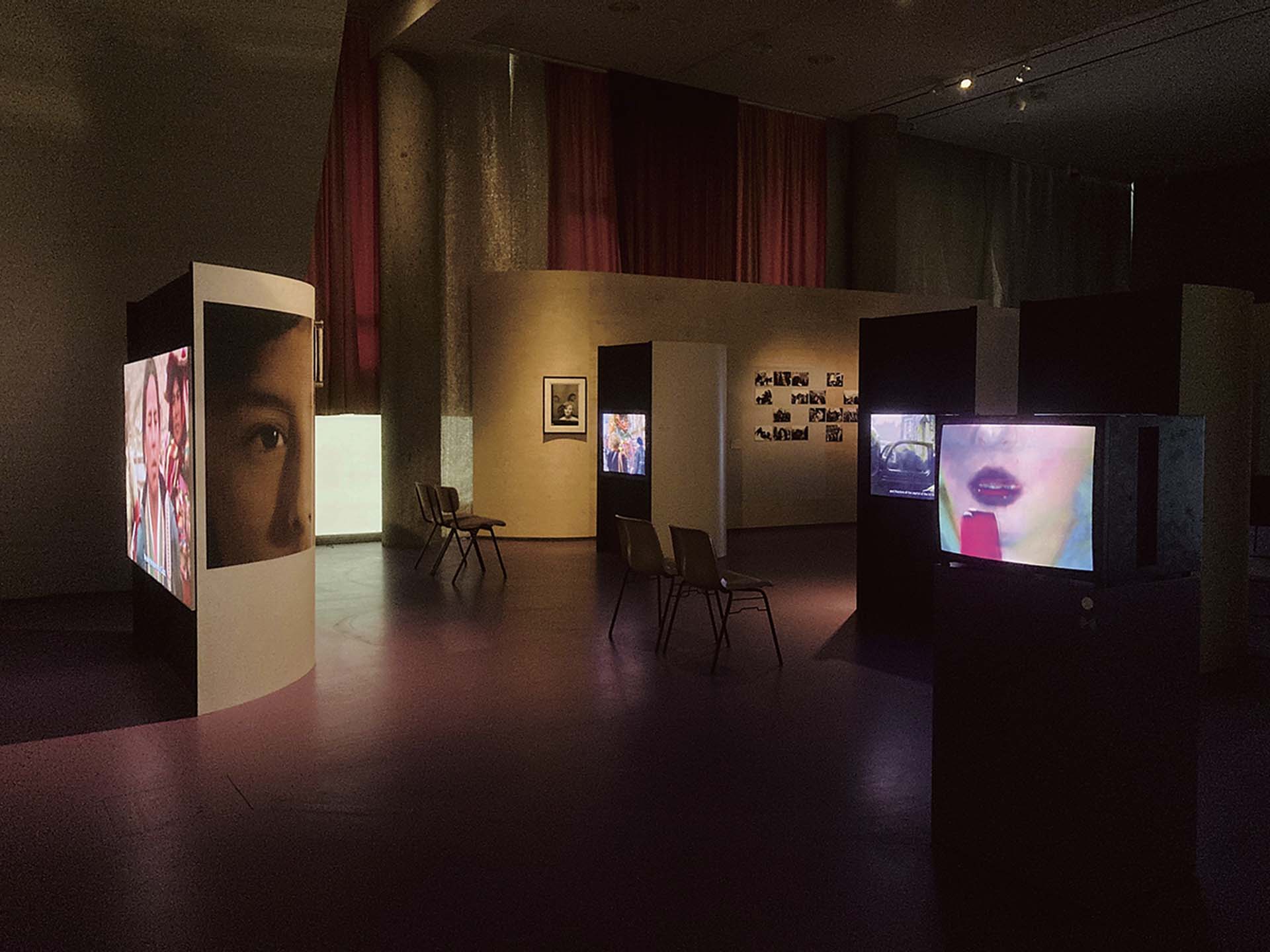 這檔展覽與前述提及的「展覽電影」案例多以單一創作者的個展為主的策展方式相當不同,「無主之地」展覽所面臨的展示挑戰,其實正是展覽本身要處理的歷史性課題:如何讓1970到1990年代這整個時代被埋沒的以女性為主的創作者們能被充分地看見?並且能夠去中心、多中心的追索其串連起的跨際網絡?如何讓展覽內容能維持意義的開放與保持對話的空間,但又不致於讓為數眾多的作品、澎湃滿盈的展覽規模太過龐雜、毫無章法?除了構思展間佈署考量螢幕/銀幕大小是否達到錯落有致的平衡,觀眾在其間能否享有舒適的觀影狀態、作品陳設間色彩的選擇、視線和螢幕的距離與高度、作品之間的聲音是否會互相干擾,這些細數起來相當繁瑣的環節,都會影響觀眾觀看展覽的感受。