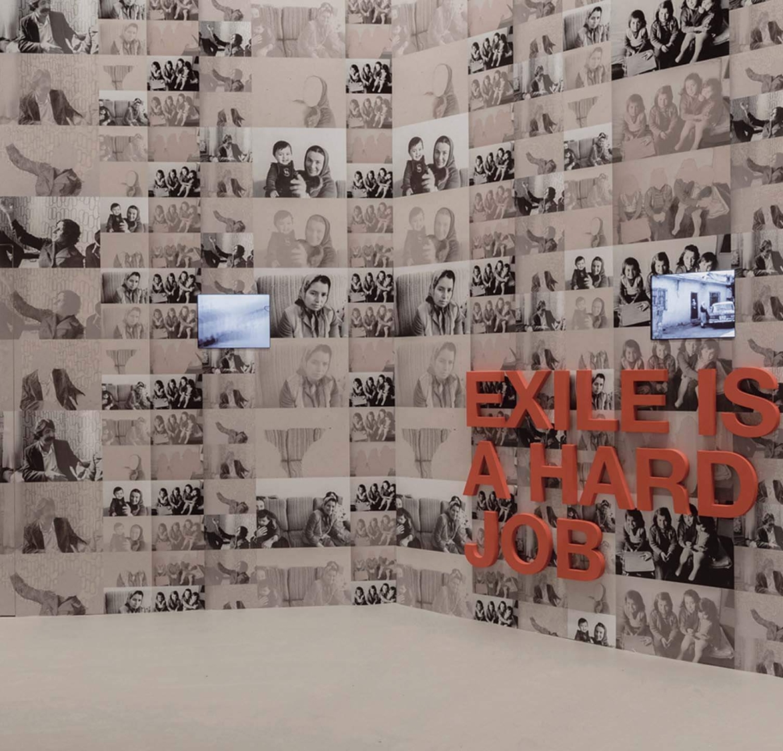 這次參展藝術家絕大多數在不同地域、文化之間遊走,政治壓迫和社會邊緣化的生活體驗成了他們的創作題材,包括本屆兩位終身成就金獅獎得主。出生開羅、長居巴黎的土耳其裔藝術家尼爾.亞爾特(Nil Yalter)以醒目字眼寫著「流亡是一份艱難的工作」,牆上貼滿了不同流離失所的人的照片,同時懸掛液晶螢幕,播放女性移民與家人的對話,流露流亡移民日常生活中被迫面臨的種種問題和挑戰。展廳中央如蒙古包的圓形帳篷象徵了遷徙生活型態中脆弱又溫暖的庇護所。義大利裔巴西藝術家安娜.瑪莉亞.麥歐利諾(Anna Maria Maioli)透過繪畫、攝影、錄像、泥塑,探索記憶和尋根的主題,堆了滿桌滿架、暗喻系列生產的未燒製黏土胚,錄像放映的是她對祖父的喃喃自語,感嘆這個世界近無休止的土地掠奪。出身摩洛哥裔法國藝術家布什拉.卡利利(Bouchra Khalili)的《星座圖》是一件扣人心弦的作品,八個懸吊的大螢幕循著八位非法移民為抵達歐洲,在地中海地區不同國家和城市之間不斷遷徙,並以手持鉛筆在地圖上畫下他們的移動軌跡。每一個人的故事都夾雜著悲慘和血淚,以及為追求一個能安穩生活的義無反顧。