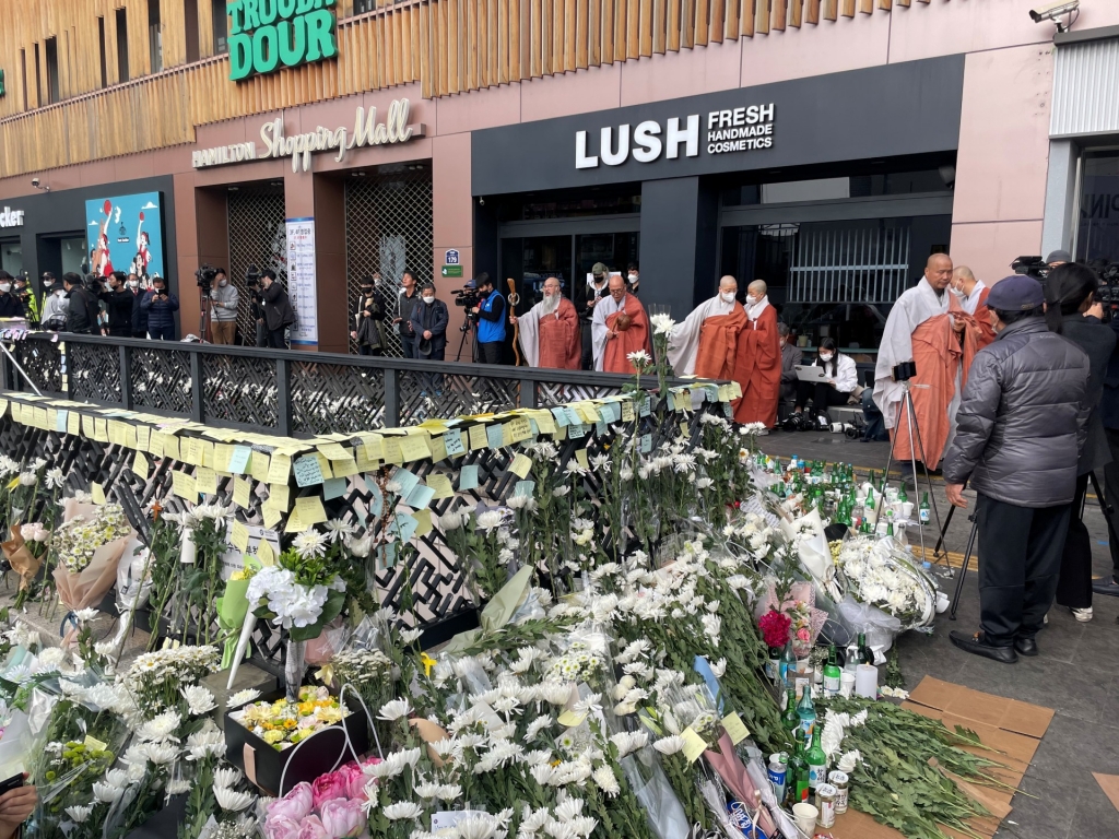 事故發生後在梨泰院地鐵站出口擺放的悼念花束。(圖片來源:維基百科)