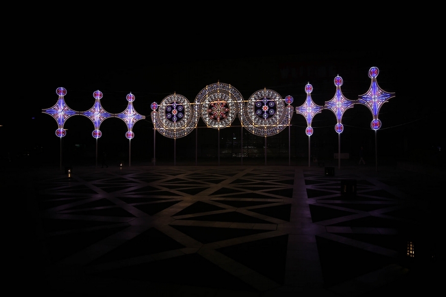 「光之書寫-2020臺灣國際光影藝術節」參展作品丹尼爾.蒙特韋德(Daniel Monteverde)《Costellazione, Messaggeri delle stelle》,LED、金屬,1480x860cm,2019。(攝影/黃繼賢,國立臺灣美術館提供)