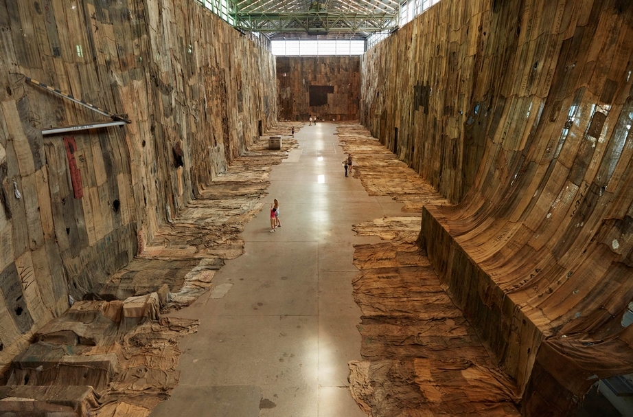 如今鸚鵡島成為雙年展的關鍵場地,其主要的工業空間和破舊的小空間對任何藝術家在此展出都是一大挑戰。來自加納的藝術家馬哈馬(Ibrahim Mahama)大型作品《沒有朋友的山頭》(No friend but the mountains)以原本用來裝載煤炭的舊麻布袋縫合在一起,大量垂掛覆蓋包裹渦輪大廳(Turbine Hall)諾大的空間,令人難以忽略的視覺震撼,藉描述其祖國的經濟活動移轉,質問出勞動與資本關係。