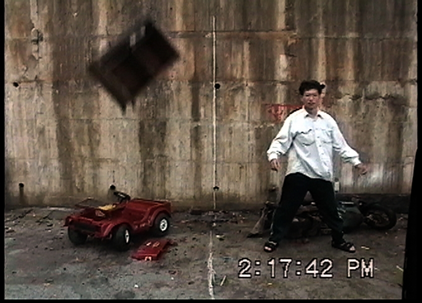 關於臺灣這類從身體展演轉向錄像運用的行為藝術發展脈絡,藝術研究者高俊宏亦曾撰文爬梳指出,1990 年代伴隨家庭手持攝影機 VHS、V8 的普及,行動性的錄像創作透過預先錄影、剪接、重組的方式,呈現出充滿影像機制的身體行動錄像。由於結合了聲音、影像等元素,再加上展出時,可以運用單頻、多頻螢幕、或進一步結合物件、網路的空間裝置方式呈現;(註12)當崔廣宇的行動轉以動態影像呈現時,其行動並非是一次性的效果——誠然,他當下的行動勢必會擾動周遭環境,無論是群眾也好、城市設施也好;擾動環境,正是藝術家行動的目的,雖然觀眾的反應為何可能不是崔廣宇最在意的重點。因著其作品是以動態影像為媒介呈現,故藝術家行動的效應,乃是「擴延」的,意義不僅在行動的現場,而更可以跨越時空,出現在美術館、畫廊等白方塊空間(white cube),亦或是黑盒子(black box)的電影院空間。