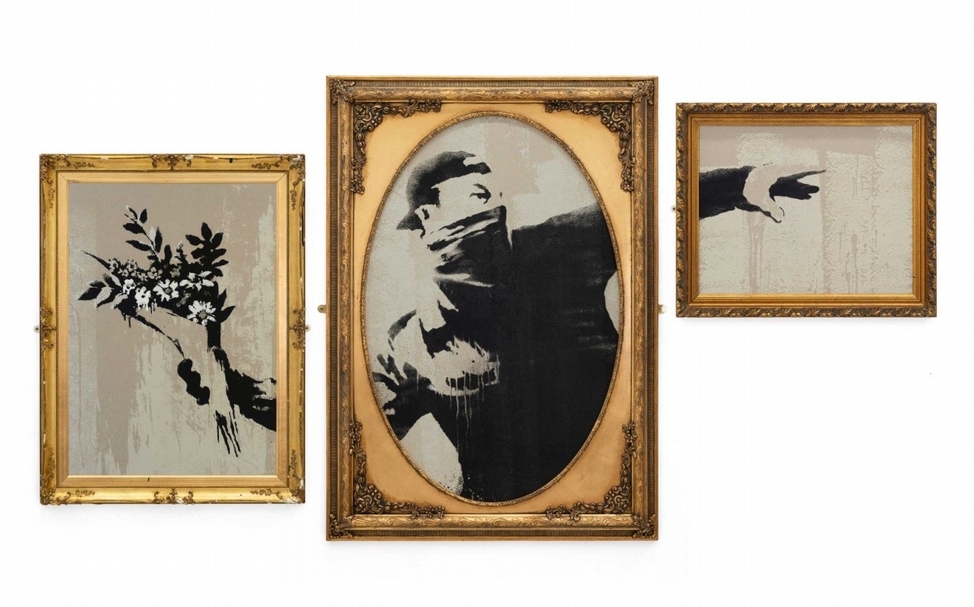 BANKSY於「Gross Domestic Product」(GDP)中提供的《擲花者》商標。(©BANKSY)