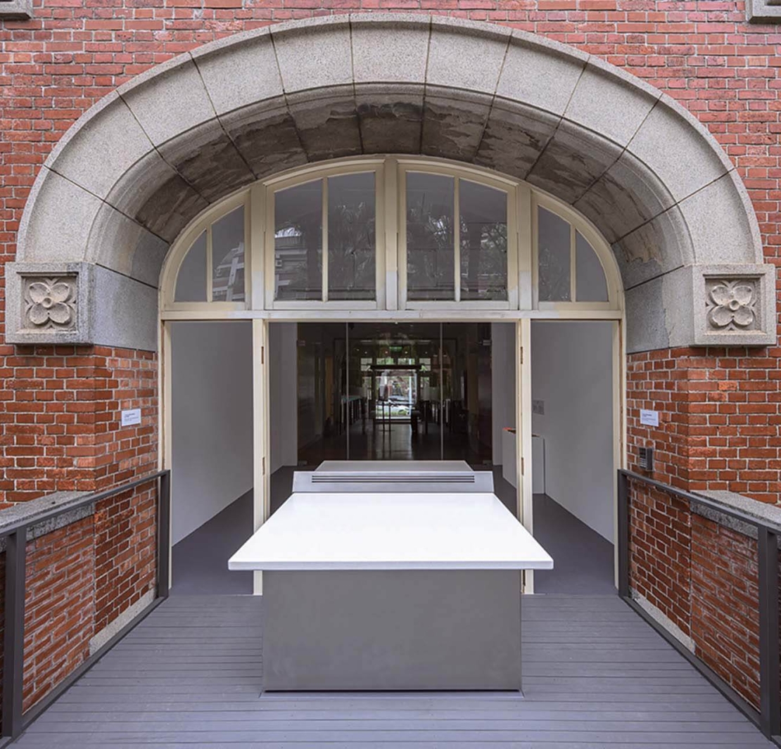 當美術館的觀眾透過這個由藝術家新設計的平台,往外一看,便可藉此窺見過去在館舍及學校運作邏輯下,無法被看到的空間,而這恰巧是建成小學校整體的古蹟範圍,與原本建成小學校的操場,因為不同機構的介入,而多次改建的痕跡。而賴志盛在平台上所設置的乒乓球桌,更彷彿隱喻了這美術館運作體制與校園管理體制一來一往的互動,或著說拉扯過程,在這古蹟空間當中毫不間斷地回返。