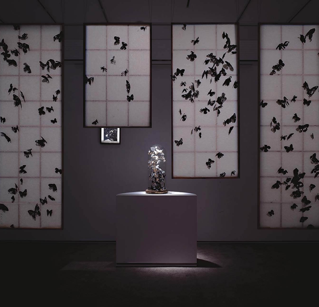 此兩件作品融合了手工紙抄造術與墨水樹植物染,將紙為載體的主軸,每隻蝴蝶都是未經裁切的純粹形態,保留了手工紙自然的纖維與毛邊質感,帶有墨跡活字版的殘片也落於蝶翅上,透過纖細的蟲針尖固定於紙面或是木枝上,在光影的投射下成為暫棲於此的蝴蝶。楊忠銘更是以牯嶺舊書街失火的松林書局之焦冊,作為紙張載體,透過大火焚燒的焦黑、紙墨的碳黑交織成涅緇群蝶。翩綿蝶影輕落於輕薄透光的障子門上,宛若文學家落筆於稿紙上的斑斑墨彩。觀者輕柔地吐息時,蝴蝶也隨氣流振翅翻飛,似乎易碎飄零如蓬斷。而障子門後,是楊忠銘最新力作《文學家之夢》,此作是一由玻璃罩保護其中停留由潔白至黛黑的墨蝶。值得注意的是,這個罩子的底座並非木頭,而是以焦黃如木色的焦冊紙頁,一層一層地捲成,並且在最前面留有一行文字:「在唇與吻之間」,指向了紙蝶停留於枯枝宛如輕柔啄吻。彷彿一掀開玻璃罩則狂隨柳絮,蝶舞無蹤。與同樣以文學為作品核心的「時光文件」系列不同,後者探究在歲月中的亙古不迭,而前者則是生命短暫如蝶落,稍縱即逝。然而兩者產生巨大的對比,猶如波特萊爾對於藝術的探究:「現代性就是從歷史中探詢詩意,從轉瞬即逝中探詢永恆。」(註2)展現「美」所擁有的二重性,一是永恆的本質,二則是偶然、變換的現代。同樣如人一般,同時嚮往永恆、擁有理性,但又同時只存活於短暫的俯仰之間。