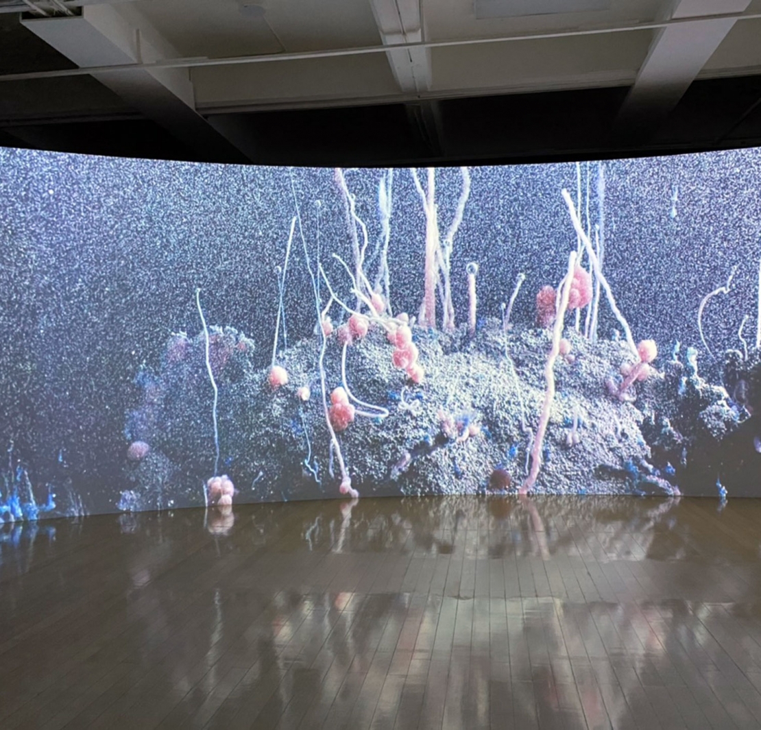 從這層意義來看,這些作品也企圖表達拉圖的危機意識:「如果你知道全球化星球的現代化計畫正走入死局,那麼你會去哪裡?如果要按現代的生活方式,必須耗掉整整六顆地球的資源,那麼想生活在單一個行星的範圍內時,你該怎麼辦?」換言之,觀眾惟有透過策展宣言的交叉對照,才能定位這幾件展覽電影的社會意義;但在定位意義的同時,又因為影像本身的抽象曖昧,刻印在觀眾印象中的,可能僅僅是那些色彩斑斕或流動形體所形成的圖像隱喻。於是,展覽成功地在宣達其社會問題意識的同時,又將藝術性表達收編在其話語建構中。換言之,美術館的發言慾望,透過藝術家的實踐,被觀眾讀取。