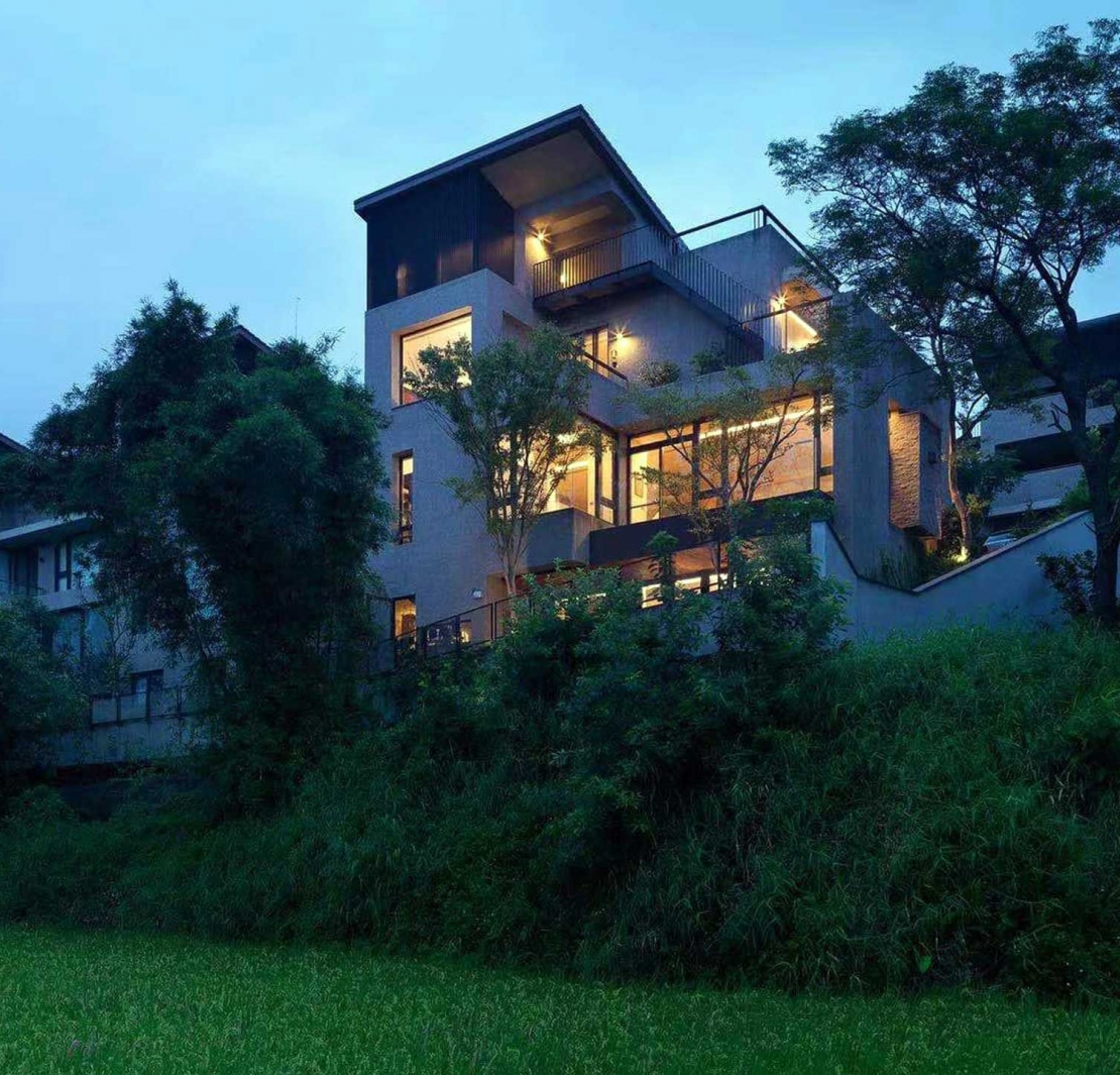 他們描述說,當東方第一道光升起的同時,襲園就用一整棟清水模建築,記錄著日出至日落的軌跡。而夜間的襲園,由於透過外牆的間接打光,讓輕薄的屋簷,呈現出輕盈待飛的樣貌。從室內透出的燈光,搭配室外彰顯建築輪廓的戶外照明,厚實的清水模建築,也顯得晶瑩剔透,美不勝收。