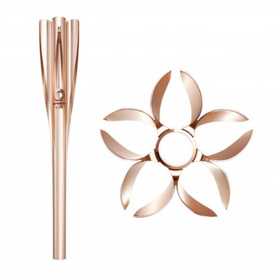 長71公分,重達1.2公斤的火炬,從上方看便能見著優雅的櫻花形狀,在顏色上,也特別融入粉嫩的櫻花色與金色,成為特殊「櫻花金」色系。在技術上採用了與新幹線一致的鋁擠壓工藝,其中有3成素材,則係回收來自岩手、宮城、福島等3個受災縣,總計824戶臨時住宅使用的鋁材。