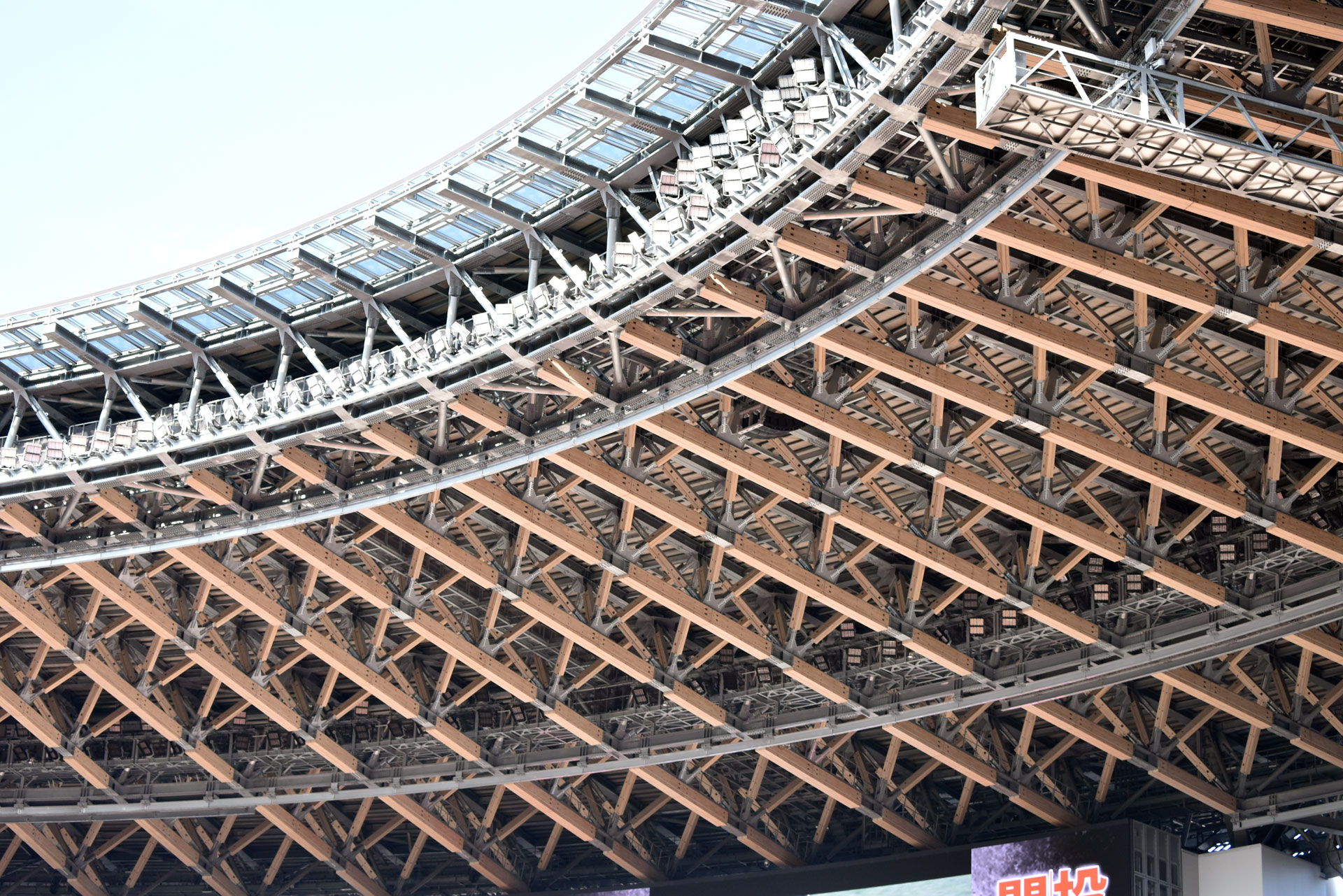 隈研吾解釋,他的設計案,從地面看上來是由樹木做成的屋簷,那是他從法隆寺的五重塔,由下而上觀看所捕捉到的概念。他希望將日本傳統建築的智慧,融合現代的形狀創造新的建築。整體設計風格,圍繞著隈研吾擅長的和風禪意與自然巧妙地結合,運用大量木材來展現日本傳統。滿載綠意的運動場館,採用原木建材打造360度圍繞的外簷屋頂,並使用傳統建築技法和設計元素,加上木材使用來自日本全國47都道府縣提供的杉樹和松樹木材,可說是象徵日本上上下下,全民同心協力共同參與奧運主場館的建設。