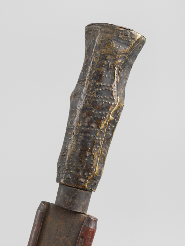 人像刀柄,內層為木雕像,外表全件包覆黃銅片;銅片表面頭髮和身體部位佈滿釘紋呈現紋身裝飾。人像呈站立狀,雙手張開平舉胸前。刀柄底座為一突出素面竹管,底端中央有一圓孔,可以插入刀身。……應該是屬於南排灣的造型。(註5)