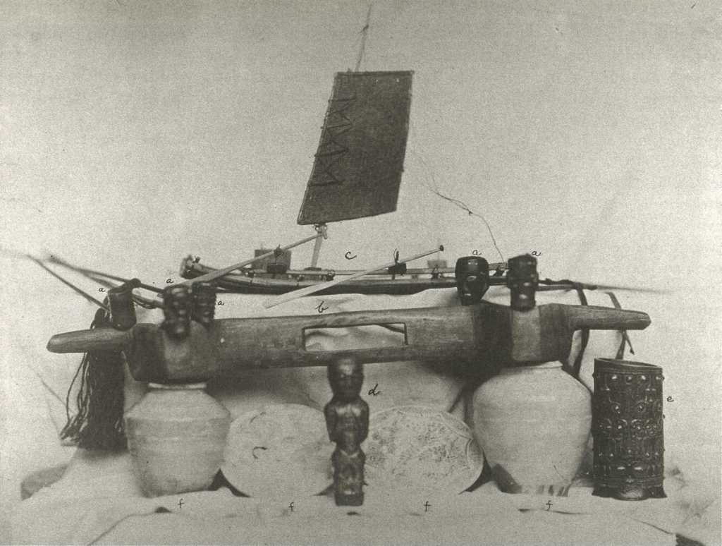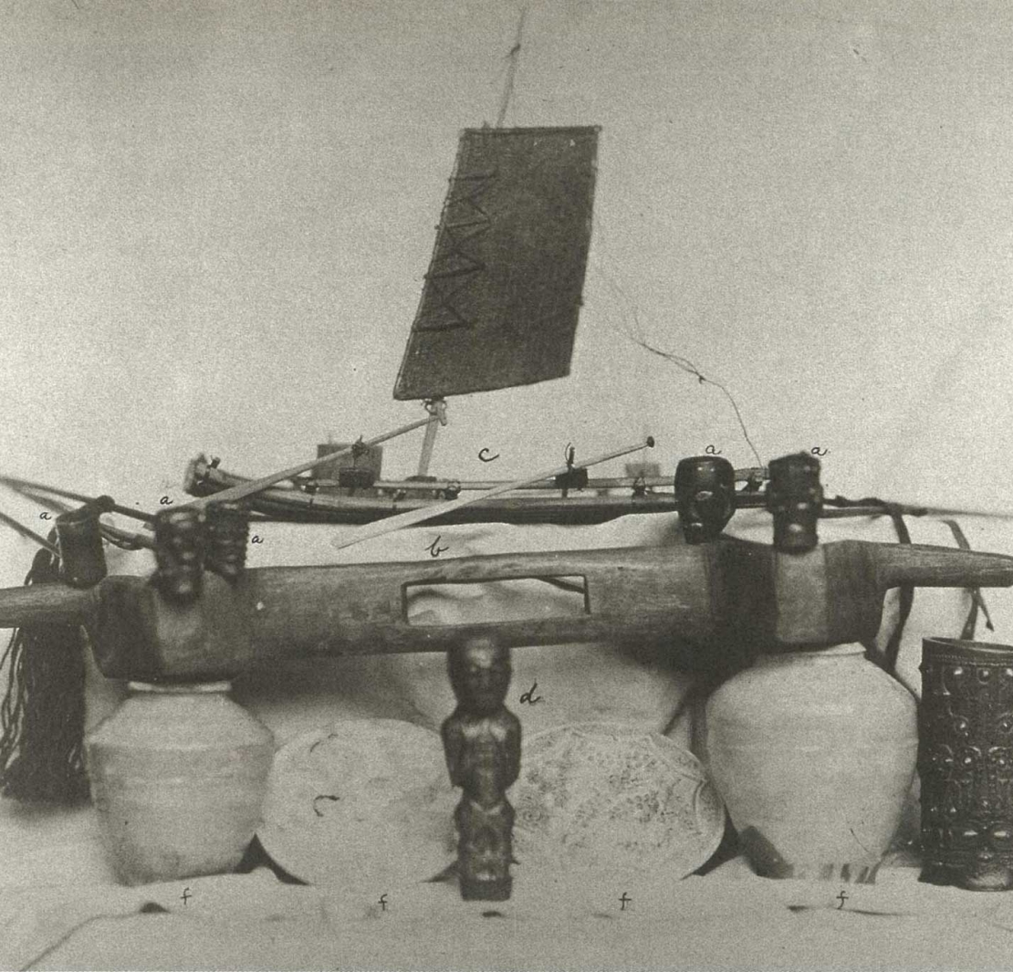 當然在原始蒐藏者李仙得未能提供充分資料的情形下,此人像刀柄的實際用法與入藏前的使用脈絡,恐怕也只能停留在憑供後人想像的程度。但是從各種文字描述與圖像等非物質的線索上看,我們有理由相信李仙得的原住民蒐藏品,當不只於目前列於線上資料庫上之數,例如他在《臺灣紀行》裡所附的一張文物合照裡,除了人像刀柄、連杯與戎克船模型是目前藏品以外,照片上有5支排灣木雕菸斗、2件安平壺與中式瓷盤,以及1件排灣木雕祭杯,都不見於目前蒐藏中。這顯示目前所知的李仙得蒐藏恐非其生前所收的全貌 (註7)。
