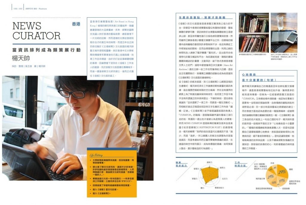 印象最深刻或是他啟發我重新定義自己對於工作的想像。他提到《主場新聞》給予每位負責議題版面策畫的工作者,名片上的職稱都是「Curator」,而非藝文媒體工作者經常有的「記者、編輯」職稱。「News Curator」這個在新興職業別,是來自美國《哈芬登郵報》(The Huffington Post)的創發概念。天帥解釋:「我們的信念是當代社會資訊不是『過少』而是『過多』,所以媒體人的做法也調整為非製造資訊,而是考慮如何把巨量繁雜無意義的資訊,在適當的時空中排列展示,成為有價值的意義,如同策展人整合、展示藝術品的行為過程。」他的這段話一直深深烙印在往後我處理策畫性內容的時刻。一段時間就會被詢問為何不去「策展」或當「策展人」,但我其實一直覺得自己的工作並非和「策展」無關,或是不是「策展」。在面對工作時,其實也一直在以策展的狀態與內容和作者對話,差異只是在我們並非建立一個實體的空間內容,而是將內容策畫注入一本雜誌或是媒體平台上。