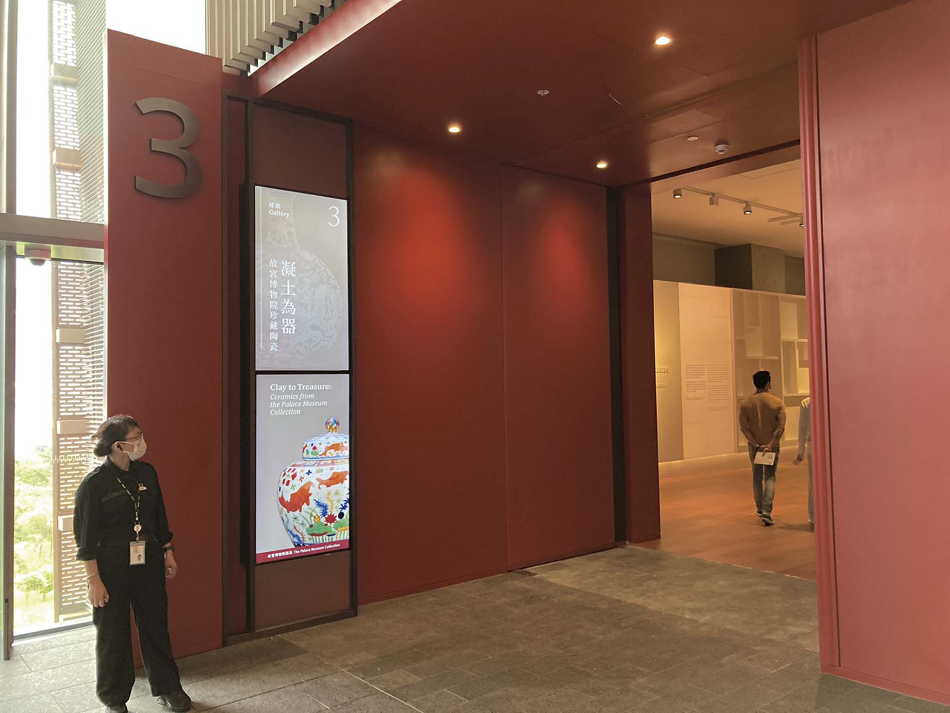 香港故宮建築的北京聯想,以紫禁城主要顏色為基礎,米金色點綴赤紅和冷灰,遠看似由幾個矩形併合而成,近觀則發現幾個細節,都呼應著現當代雕刻藝術的技法──大膽地採用多元物料,若非近觀,會以為那是傳統木材,原來是赤褐色金屬,表面的粗糙感竟又帶點工業風,令人聯想展館內《考工記》等典籍的立體展示,遙遙呼應M+香港藝術家大膽嘗試的前衛風格。