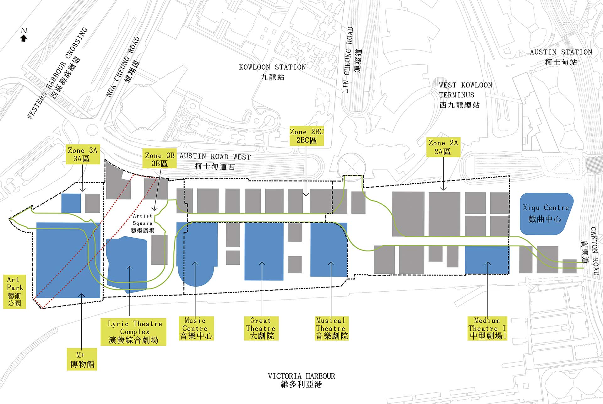 香港故宮座落在西九文化區以西,相隔海底隧道入口,相連M+博物館,可從藝術公園沿路步行到西九文化區建築群的主要區域。前文提到魚鈎狀,就是這邊以戲曲中心為終點的建築規畫。由M+博物館看一旁的工地,尚有未竣工的演藝綜合劇場、音樂中心、大劇院、音樂劇院,將草創期在草坪上站立狂歡的文青天堂,發展為表演殿堂的高高在上,無疑是要讓青年往室內走去。屬於青年的戶外空間,再沒有昔日的寬廣,多少象徵著重塑文化身份認同感的工程,連同西九文化區建築工程一併完成?如有踏足M+博物館的參觀者,或又有另一看法。