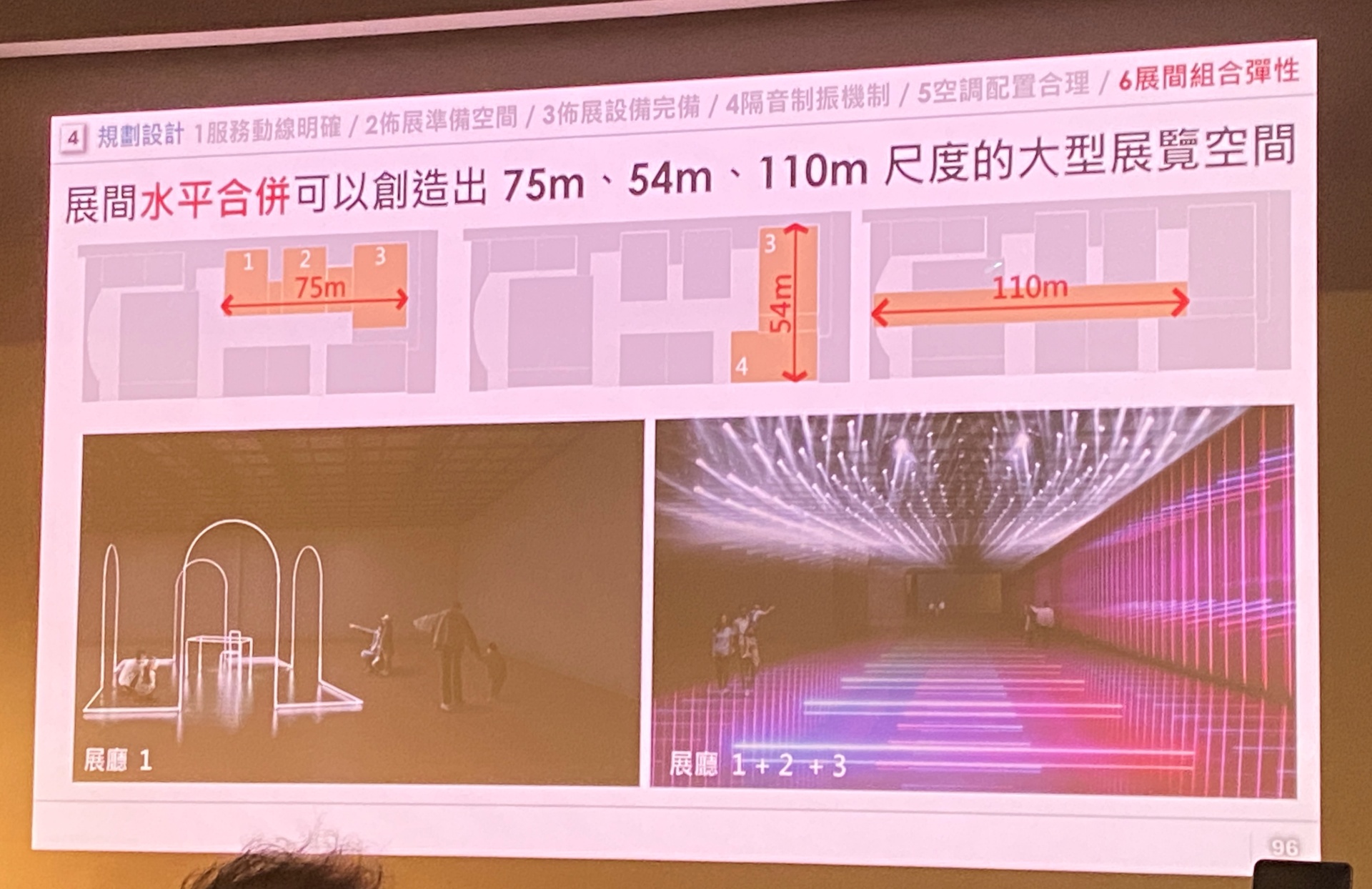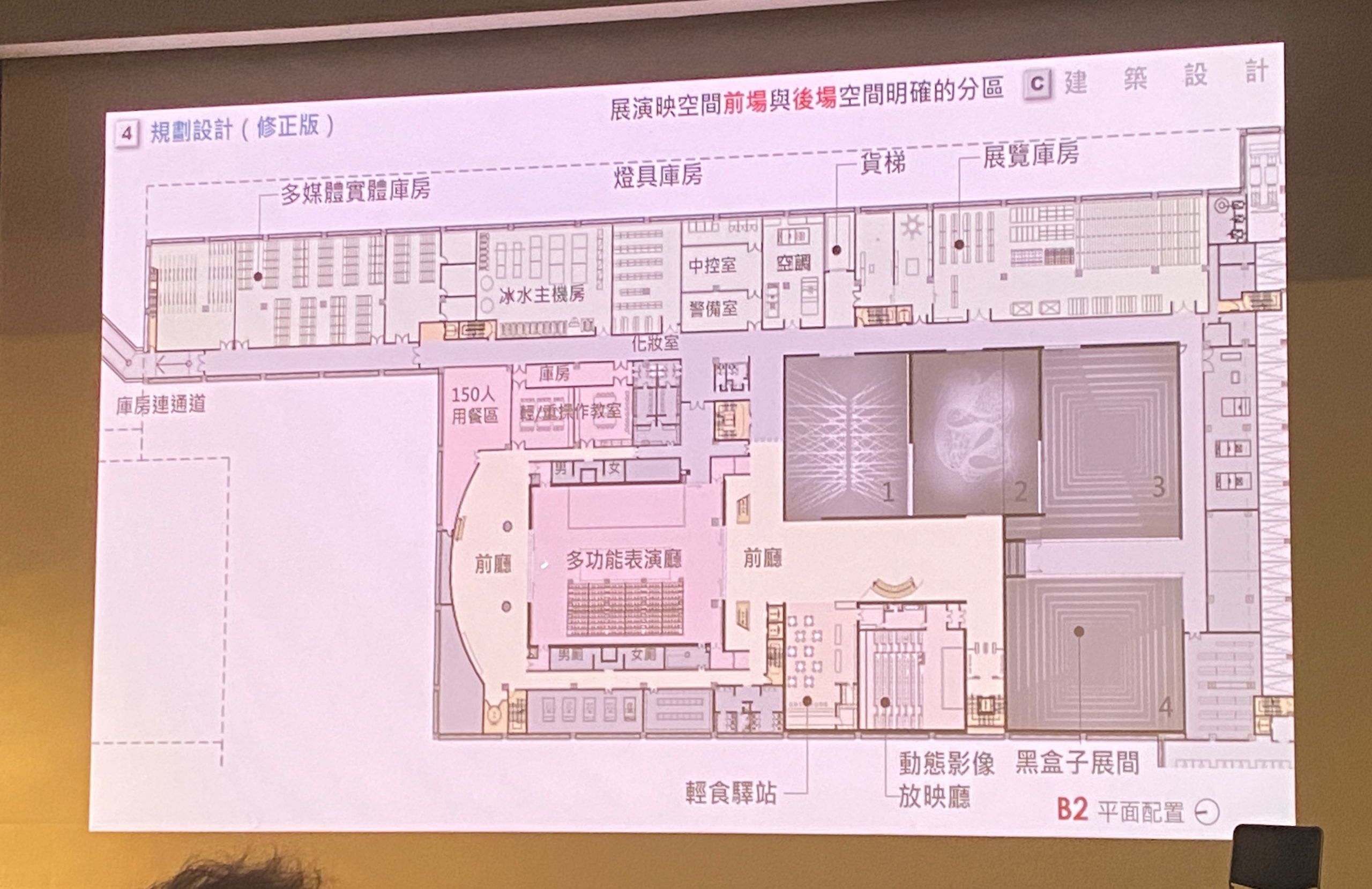 另個亟待思索問題在於,在空間設計準則書裡也被訂為「標配」的多功能表演廳,和動態影像放映廳,可以理解當代藝術的領域早已包含電影、紀錄片、實驗短片與全幅錄像,所以「展演映」的需求自當被標舉。如果從劉培森簡報裡的空間策展可能性的舉例,這個多功能表演廳將有可能是一間公務機關必蓋(俗稱「公版」)的新世代禮堂、新型演講廳。如果和舊館B1的視廳室功能如此雷同,那是不是舊館更新內裝設計,新館豐富交流、教育推廣空間的設計,會引發更有效果的作用呢?