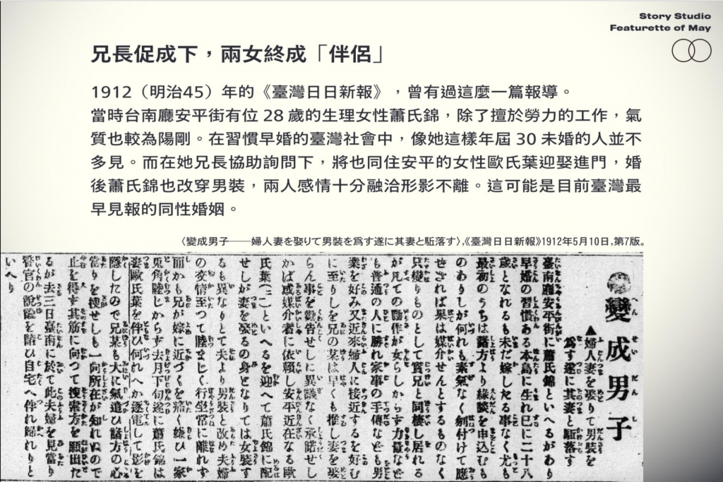 另外根據謝易安的〈離軌的身體:日據《臺灣日日新報》中的性別越界〉一文中的說法,明治45年(1912)的《臺灣日日新報》第4290號中,便刊載了「變成男子:為娶妻而扮男裝後與妻子私奔」一則報導,內容指出:臺南安平有一位名叫蕭錦的女子,雖然出生在有早婚風俗的台灣,但28歲的她卻仍末結婚。曾經有人上門提親,但是她都冷淡地拒絕。