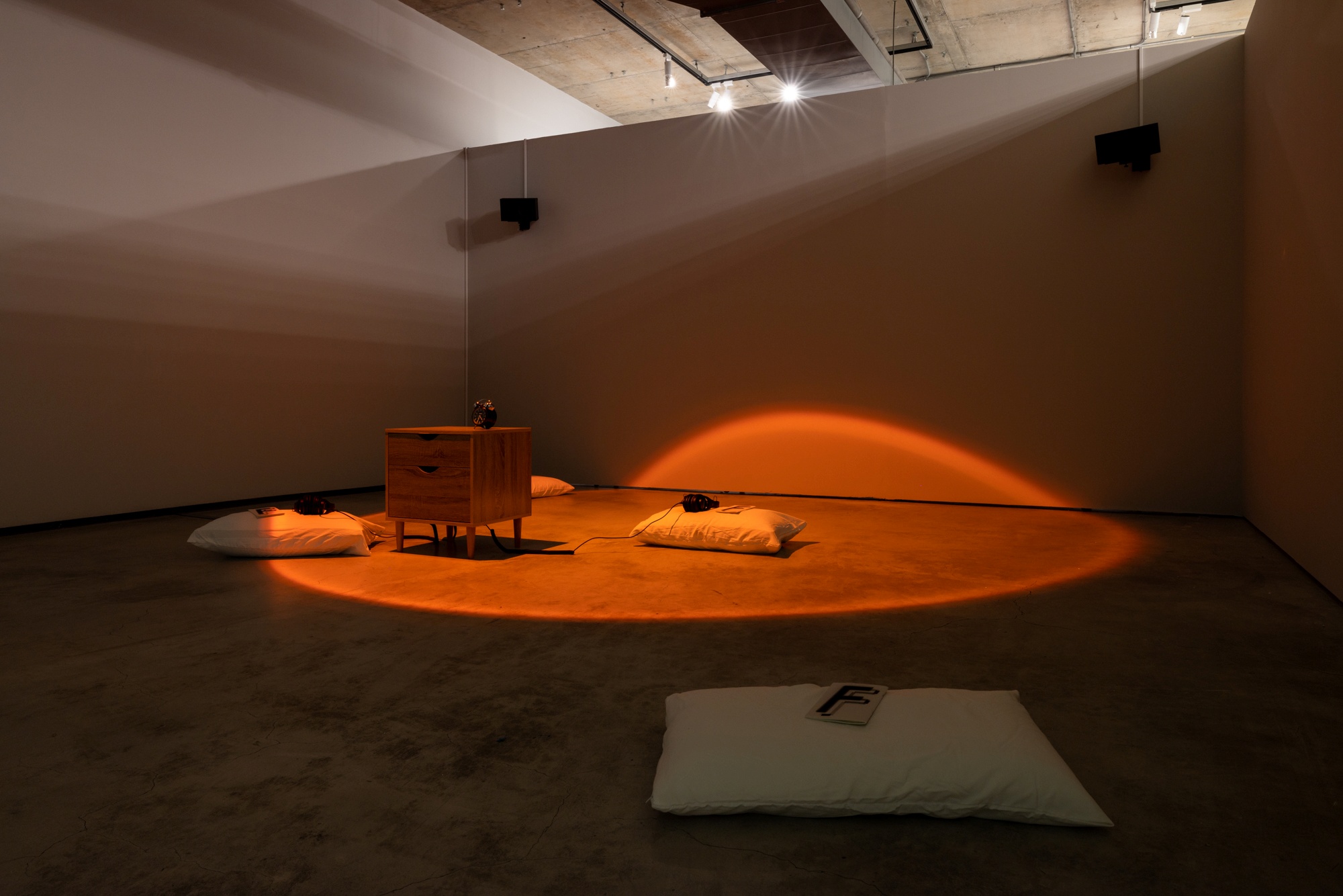 這樣的尺幅對比,也出現在張紋瑄與廖海廷的作品《F的故事》和黃孟雯的《遊蕩》當中。前者的作品從人講話的音調出發,由張紋瑄以近似理性分析與論述化的文字,將音調的高低設定為男性化或女性化的標準,之後再由廖海廷將這充滿聲音感的文本處理成聲音裝置,並將輕便的裝幀本,放置於一個近乎全黑,只有微弱紅色光圈的空間當中,提供私密感極高的閱讀情境。