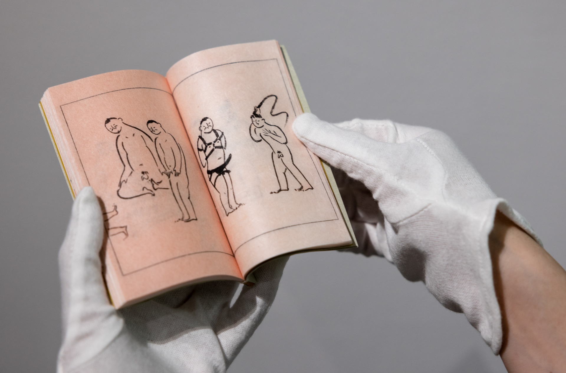 有趣的是,這樣的「尺幅」對應,也出現在近期TKG+ Projects由策展人莊偉慈策劃的「背陽—情慾伏流及其隱現」。展覽中,藝術家簡翊洪的作品《問愛書》中,以東方袖珍春畫本的形式,也是最能表現出某種私密性的尺幅,透過草圖式的非連續圖像,描繪出自身對年長男性的情愛幻想。有趣的是,與其對應的范揚宗和呂浩元所使用的「西式繪畫」,嚴格來說是個以傳統生理男性為中心,且展示尺幅多傾向直面公眾的藝術媒材,但他們卻在不同的規格之下,同樣將不見於異性戀男性主流社會的同性情慾明確地傳達出來。