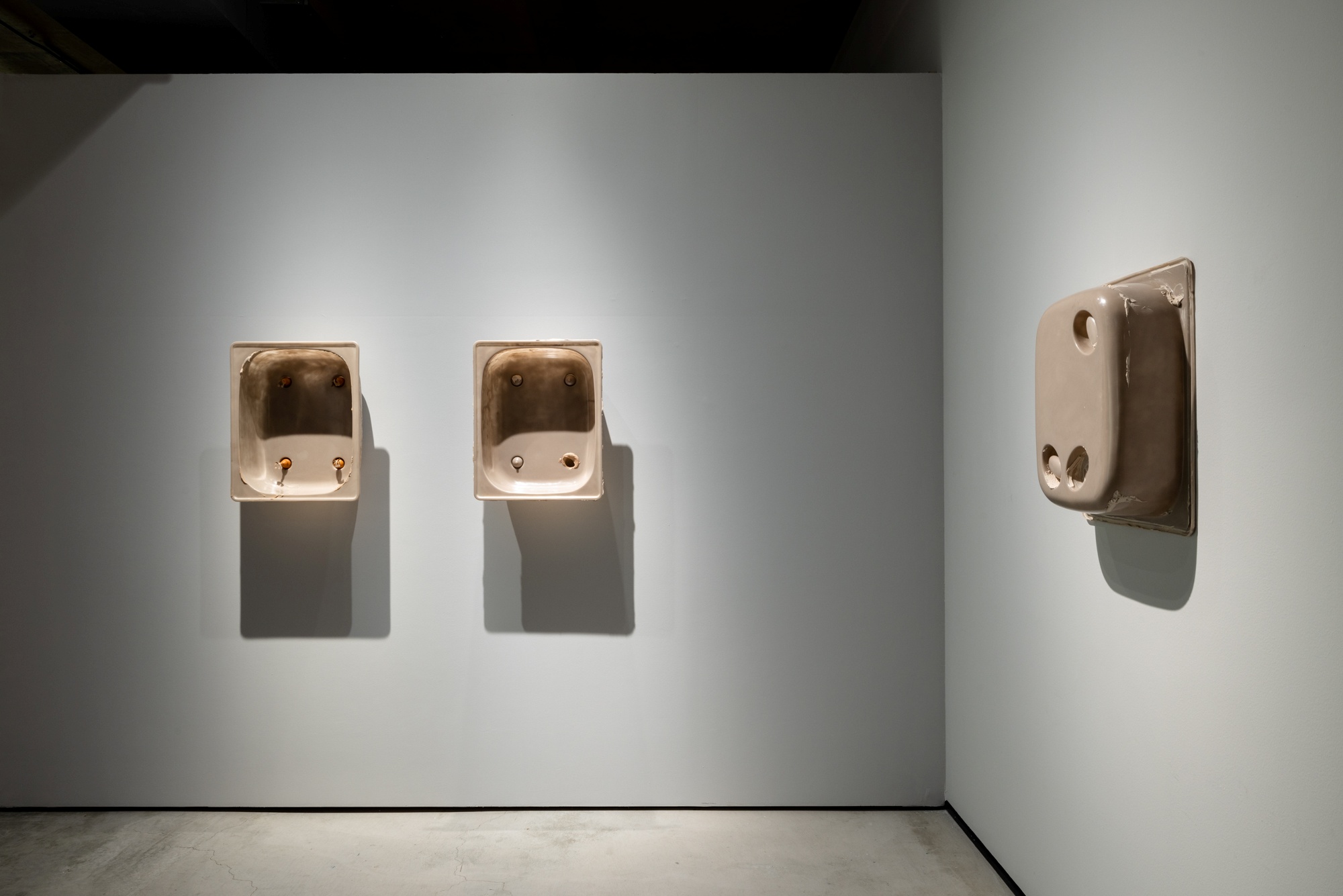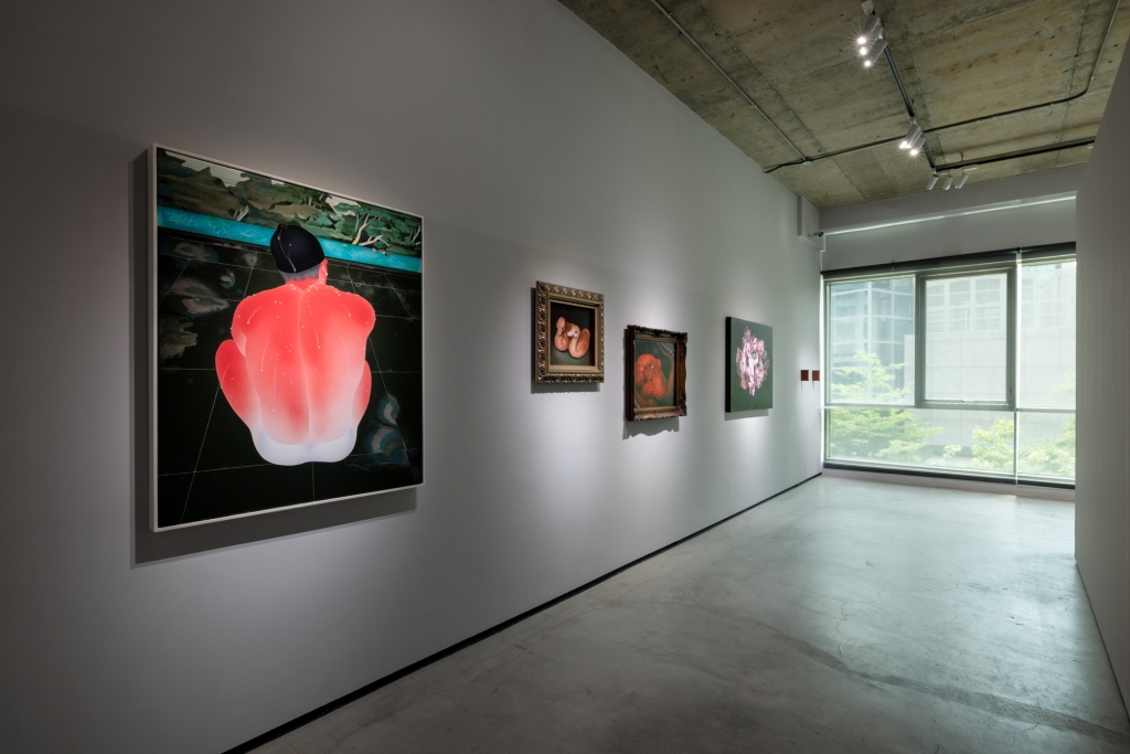 例如,范揚宗作品《泳池系列─暗色的磁磚》,以輕盈,甚至是有點窺視的視角觀看公共空間的游泳池中的男性身體,展現出自身的凝視和慾望。呂浩元本次展出的作品如《ㄚㄚ》、《八爪魚》和《藤壺》等等,則是將靜物描繪成肉感,甚至生殖器化的物件,表現出近似超現實的情慾狂想。由此可見這三位藝術家的畫作,分別透過不同的創作尺幅,讓同性的情慾想像在公眾與私密的界線中迴盪。而另外一件羅智信的《Sink, Sunk, Suck I》、《Sink, Sunk, Suck II》與《Sink, Sunk, Suck III》也承襲其一貫以現成物與傳統雕塑對話的創作風格,所謂「小本的」跟「大件的」尺寸,兩相對比特別令人玩味。