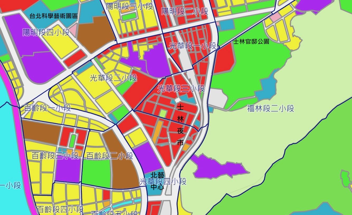 關於台灣都會形成的歷史是什麼?以今年台北白晝之夜的四個策展場區位置所在地來看,攤開市政府都發局的土地使用分區圖,紅色區塊代表被劃為商業區,機關用地為藍色(如北藝中心、台北科教館所在的台北科學藝術園區),紫色為學校用地,綠色是公園,黃色則為住宅區,以及更特別的「混合區」為橘色。