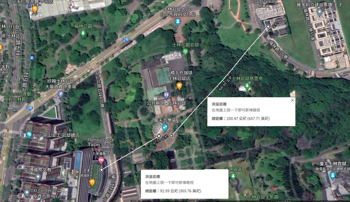 再簡單使用Google map的距離測量工具,會發現,士林官邸音樂台距離東北方的住宅區僅有200公尺,而西南測距離這次大會的指定住宿贊助的士林萬麗酒店,雖然飯店位屬商業區,但一樣面臨類似的噪音環境感受,和萬麗酒店一劃在同一個紅色商業區街廓的,則是中山北路4段名宅「欣翰士林官邸社區」,雖然一樓和局部樓層少數有商業使用,但大多數是大坪數大樓社區住宅,計有上百戶之多,這個住宅大樓距離音樂台距離也只有120公尺。