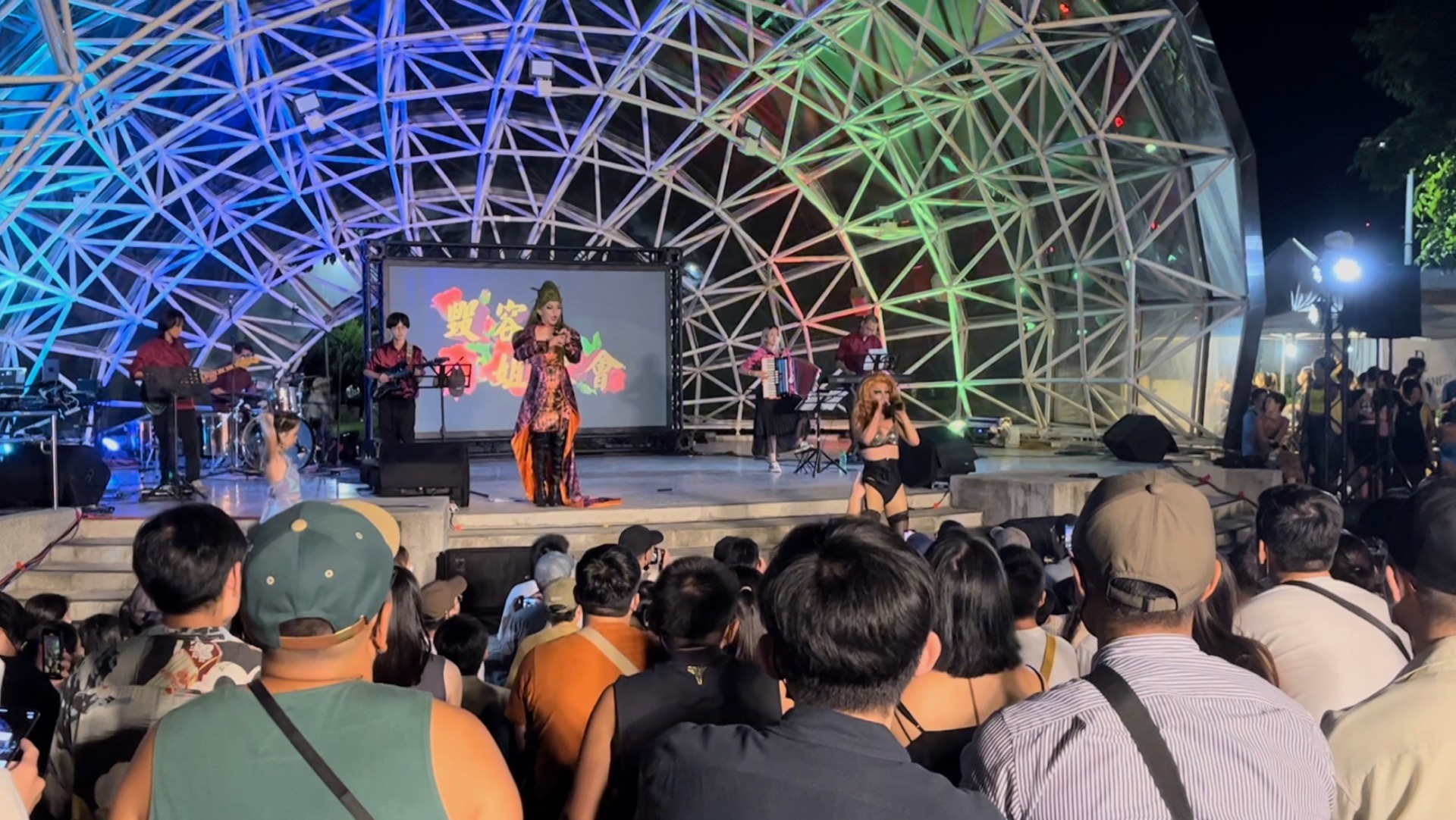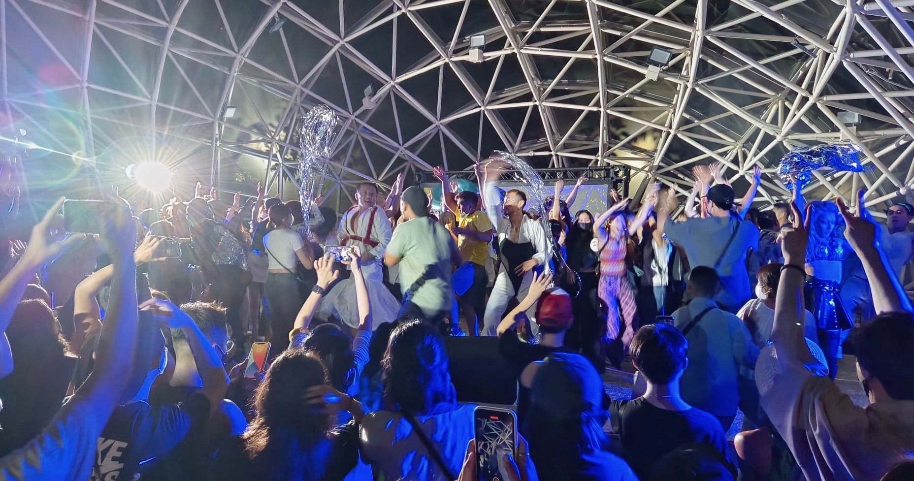 10月2日子夜,士林官邸公園成為本次白晝之夜延續參與熱點的主力展區,所以大多數還在士林流連白晝的文青和市民們,多半選擇前往這裡遊走閒晃,而較為動態式的演出就以官邸公園音樂台為重心。然而,從午夜演出的毀容姐妹會,到夢東(Mong Tong)×設計師的仙界傳說、Betty Apple領軍的Social Dis Dance節目「4:4 震能量經典夜總會」,即使這裡已是本屆白晝之夜比較稍微吵不到在地住宅區的地理位置,仍然因為環保局從晚上10點後密集收到居民投訴噪音的緣故,嚴格監管活動場地的音量,原本音響公司已安排頗為袖珍型的外場擴音系統,只能更以低於80分貝的微弱音量放送。