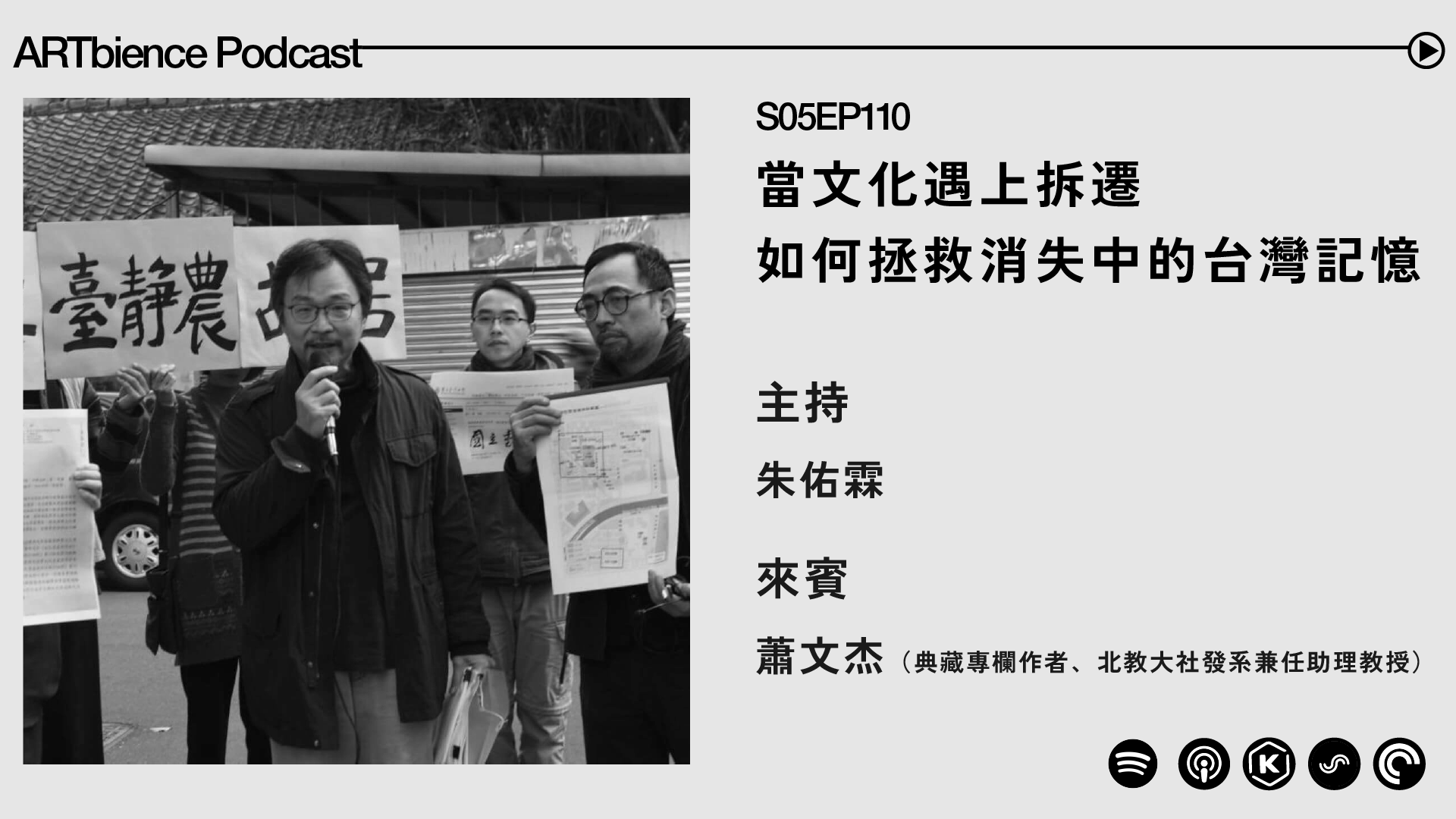 節目後段,我們也會談到制度之外的力量。民間社群、地方行動者與新世代媒體如何介入保存,並形成真正推動文資的底層能量;同時思考在都市更新、全球化與氣候變遷等多重壓力下,臺灣文化資產應如何重新定位。