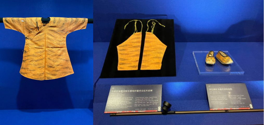 這些小衣服,讓我們跳出功過,來好好端看一個小孩:或許是一個名叫「永琰」的小孩,穿著一件「蟒蛇」圖案(其實是一條小金龍)的衣服,這個孩子正和家人過元旦。另外一個穿著虎皮套裝的小孩,名字叫載淳,腿腿還綁著虎皮套褲,心想好在不是禮服,讓我行動自如。