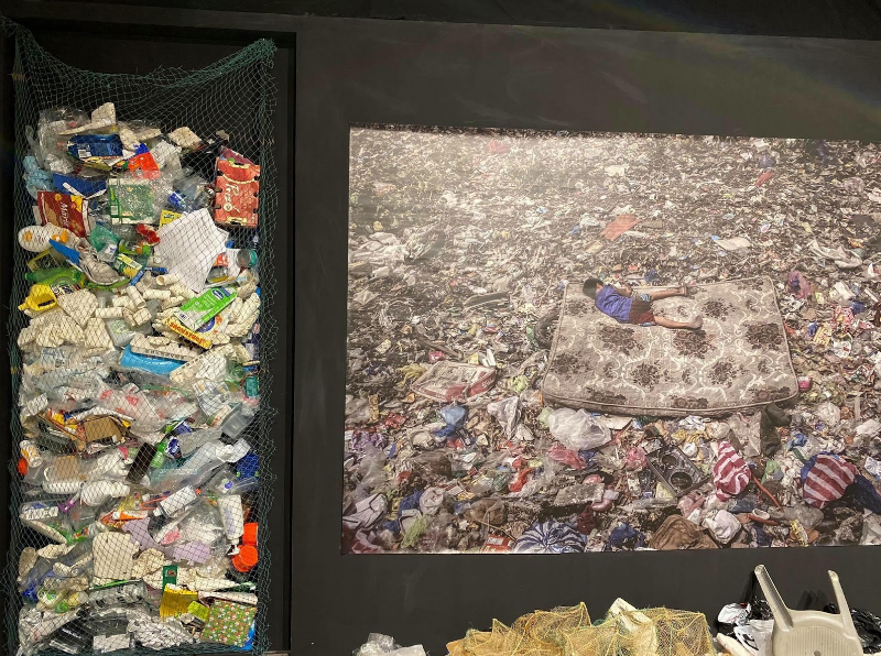 最震驚的位置在這裡,展場只放一張相片:「一個孩子躺在一張漂浮在帕西格河的床墊上。四周漂浮著一層厚厚的垃圾。他只是每天無數個在帕西格河裡收集廢品的其中一個孩子。由於垃圾密度太大,人們甚至可以在大部分的河面上行走。」(展場解說)相片前方是大片的垃圾實體,牆壁上也堆積出河面垃圾的高度。