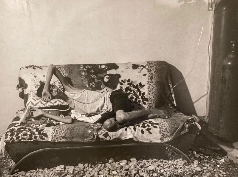 第三張,一位青年因肺部阻塞病重在家,而他在三歲就已和上面那個小朋友一樣,在帕西格河游泳生活。