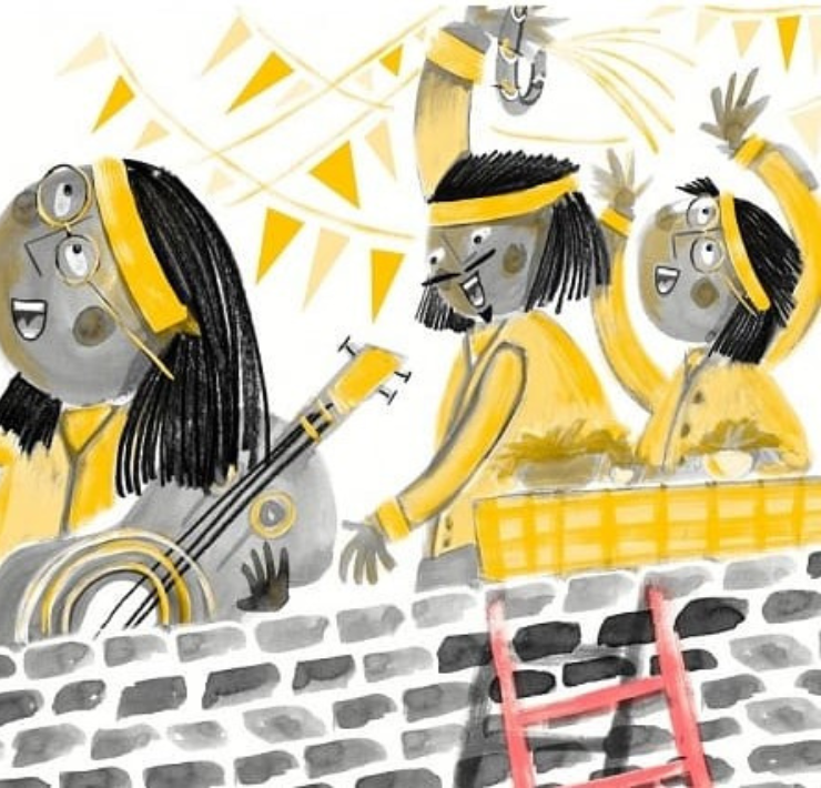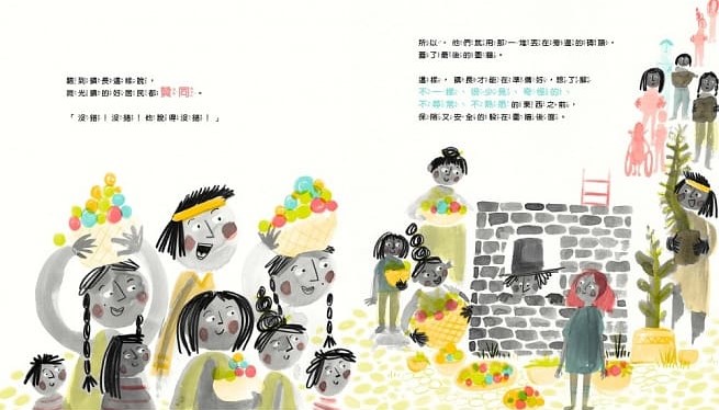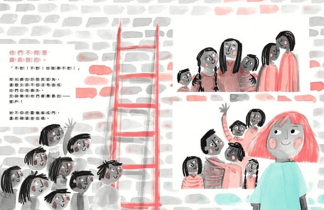 就在鎮長大發雷霆之際,微光小鎮鎮民裡有個髮色迥異的孩子,和環境背景象徵著「橋」與「溝通」的-梯子,顏色一致,當然,那個賊就是她了!東南西北的人們膚色、食物、語言、習性⋯⋯都截然不同,一樣的是:臉上都掛著親切快樂的笑容,而「梯子」都在東南西北族群的圖像裡佔有重要的一隅,不禁莞薾一笑,這「梯子」表現是一種多麼強烈的好奇心呢!