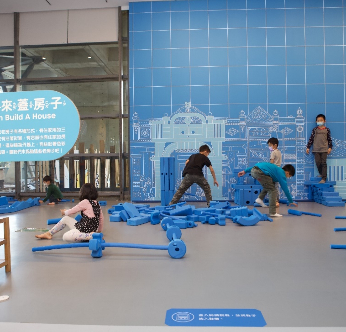 「我來蓋房子」則是一面藍晒圖牆面,可以堆積木學習蓋房子,蓋出街屋、三合院等臺灣傳統老房子;一旁則有馬約利卡磁磚拼圖桌,模擬拼貼出自己喜歡的彩色磁磚牆面。