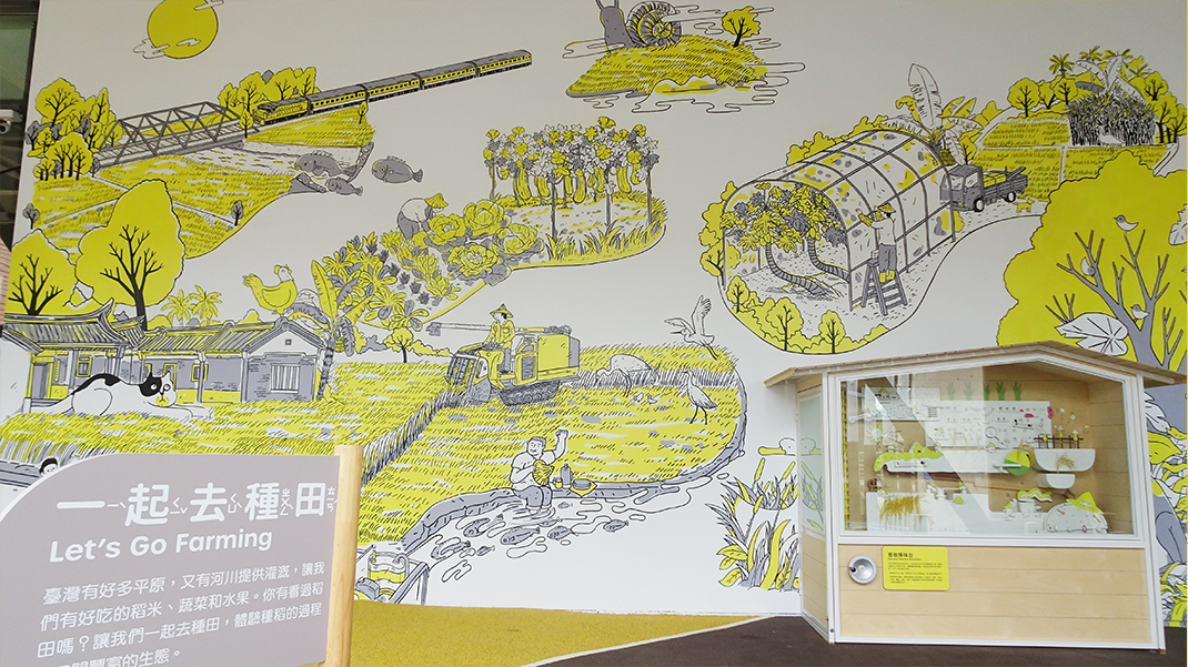 室外區的展示概念以呈現人們生存在臺灣這片土地上,順應自然地理環境而發展出來的人文景觀與生態為主,透過與臺灣地形呼應的高山、丘陵、平原、海洋等地形變化,規劃了「一起去種田」、「乘船追飛魚」、「山林找腳印」等3個子單元。「一起去種田」設計了「豐收彈珠台」與「田間俱樂部」,認識稻米生長的旅程,以及豐富的田間水鳥生態。「乘船追飛魚」則可以搭乘小船、搖動划槳,感受與飛魚和鬼頭刀共游的海上樂趣,並認識關於飛魚的傳說及禁忌,以及故事背後的生態永續精神。「山林找腳印」則可以跟著原住民獵人進入森林,拿筆拓印動物的腳印、爬進樹洞探索獵人的工具、走近淺山區尋找臺灣早期人們的活動。