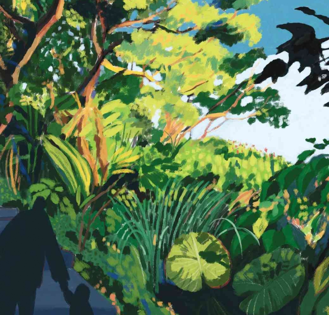 Hsin-Yi Yao目前定居在英國,每次回台灣時,總想把握時間好好看看台灣,把台灣的美好展現在畫布上,就像這次為《點讀華山》所繪製的封面「山中漫步」,其靈感來自於某次在台灣爬山時,她彎入一條人煙稀少的小徑,走著走著忽然間被眼前迷人的綠樹與光影所吸引,所以在畫圖時,她使用堆疊與保留筆刷的筆觸效果,展現出大自然動人的一面,另一方面也刻意採用全然不同的筆觸來繪製人物剪影,讓彼此相互襯托。此外,不畫出人物的細節,也提供一個讓觀看者自行將情感投射其中的可能。