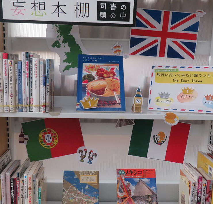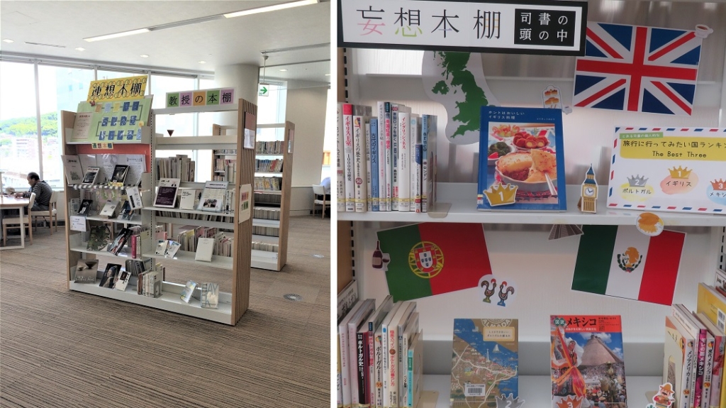這裡鼓勵閱讀的妙招還不僅如此,當讀者穿梭在書櫃之間,可以看到其他讀者寫的閱讀感想「書腰」,或是不經意遇到館員的「幻想書架」。如圖片11右邊的「館員幻想書架」就是某個館員想去旅行的國家排行榜,第一名是英國,第二名是葡萄牙,第三名是墨西哥,旁邊就放了這三國的歷史、旅遊、料理等各種相關書籍。這個「幻想書架」企劃是從開館以來一直實施的長壽企劃,館員每個月都會挑出自己喜歡的或有興趣的事物做一個小書展。除了不知名的館員之外,還有知名人物。像是圖11左邊有一個「教授的書架」,放的是熊本大學的哲學及教育學者苫野一徳的推薦書籍。