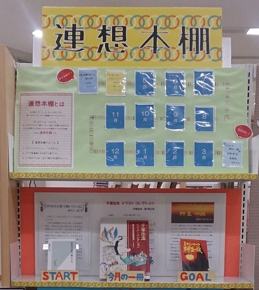 更好玩的是幻想書架上方的「聯想書架」,規則是一開始先決定好開始及結束的書,然後每個月選一本跟上一本有關連的書,然後花一年的時間完成這趟「聯想之旅」。還有另一個規定是「不可以選和前兩本同領域的書」,感覺選書相當有挑戰性!目的就是讓讀者除了自己有興趣的書之外,接觸更多不同領域的書籍。臺灣的圖書館或許也可以嘗試看看呢!