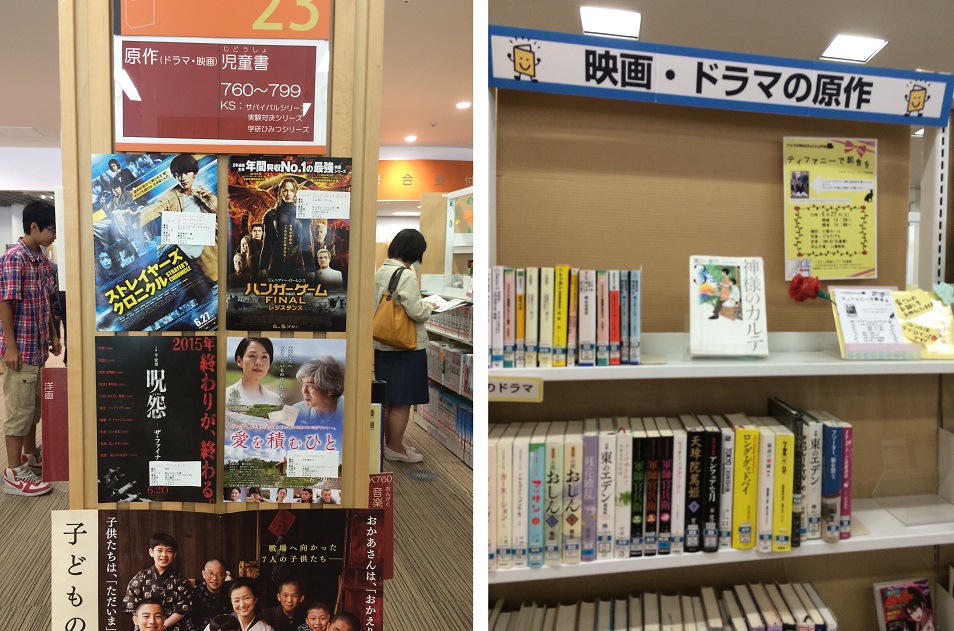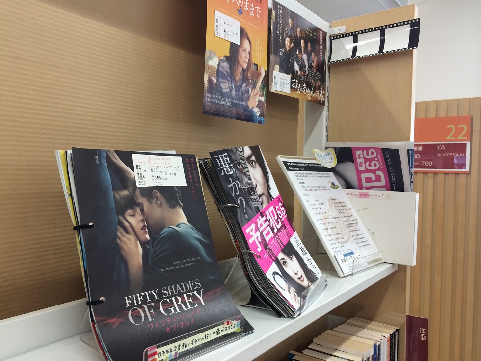 在青少年書區(YA)有個其他地方都沒看過的分類,就是「電影、戲劇的原作」,不只是將這些書籍挑出放在同一個書櫃,連電影或戲劇的宣傳海報都是吸引讀者的道具,除了貼在櫃子上之外,館員還將宣傳單裝訂成冊,在上面貼上索書號等書籍資料,方便讀者查找原著。