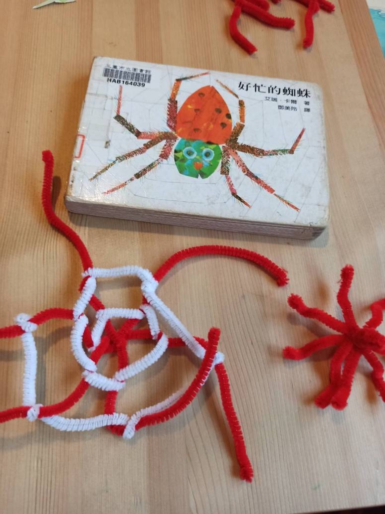 上誼出版的《好忙的蜘蛛》中描述一隻蜘蛛一大清早在農場旁的圍籬開始忙碌,對於路過的馬、牛、羊…提出的邀請一點也不心動,牠不停的織,最後牠會織出什麼東西呢?雖然作者艾瑞‧卡爾在書中運用自創一格的拼貼表現,但這次的教學活動在分享完這個繪本後,改成提供毛根讓小朋友創作,完成了一隻紅色的蜘蛛及小小的網(圖11)也是很有趣喔!
