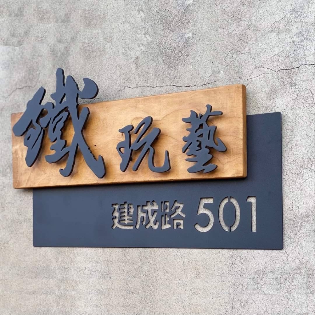 我們隨處可見木製或是塑膠壓克力的門牌設計,但若運用鐵件的搭配,可以營造有層次的立體感設計,並具有店家的個人氣質,運用鐵字鏤空與立體的搭配,就多了一份活潑。搭配溫潤特色的原木材料,還能讓門牌多了一種豐厚的質感及創意的時尚感!(圖12)