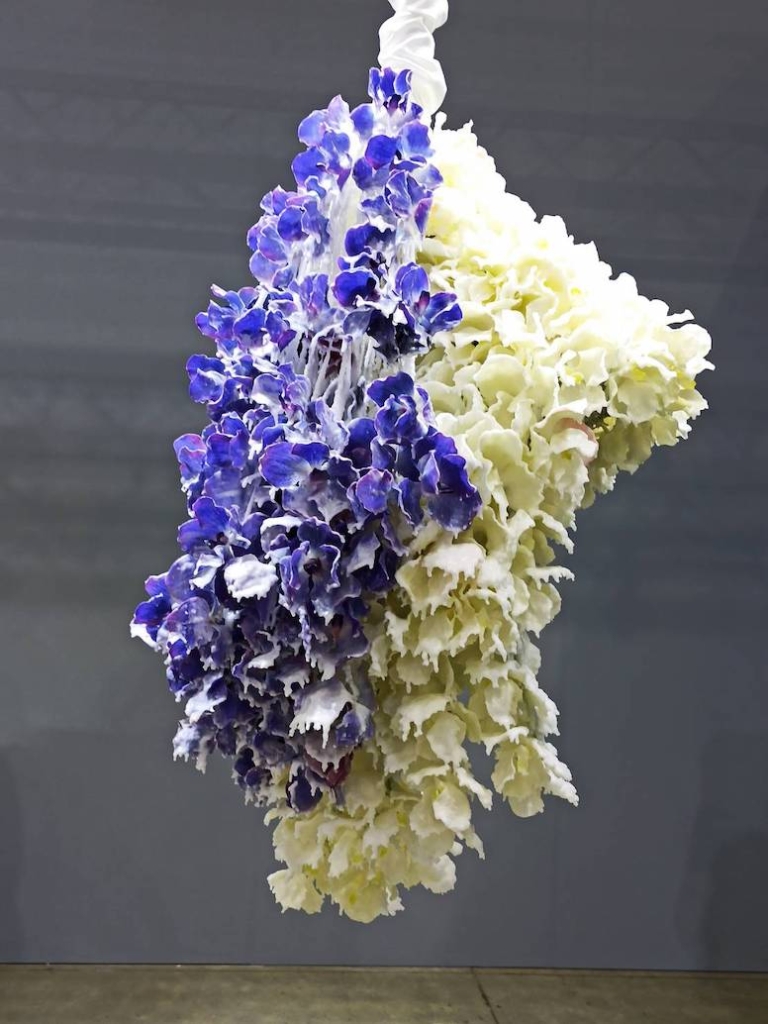 第四屆2023台北當代藝術博覽會中,被稱為「複合媒材皇后」的紐約藝術家佩塔.科因(Petah Coyne)第三度來台,她表示選擇「蝴蝶蘭」作為蠟雕題材,是受到台灣那份屹立穩定力量的感召。現場帶著寓意的《北極星》蠟雕(圖6),以懸垂於空中的紫色和白色蠟雕蘭花呈現。藝術家Petah Coyne極具標誌特色的蠟雕藝術,是以一種和「香奈兒口紅」同期發明的專利,可耐高、低溫的「配方蠟」媒材製作的。