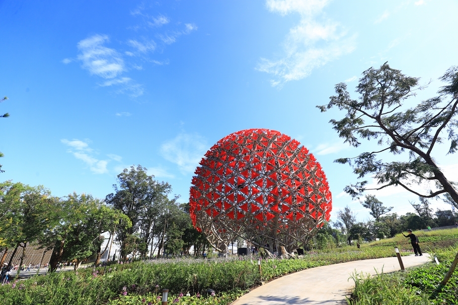 它可不是新娘拿的「繡球」,而是700朵的「機械花」! ( 豪華朗機工|聆聽花開的聲音|聲音、機械裝置|2018。(臺中市政府提供))