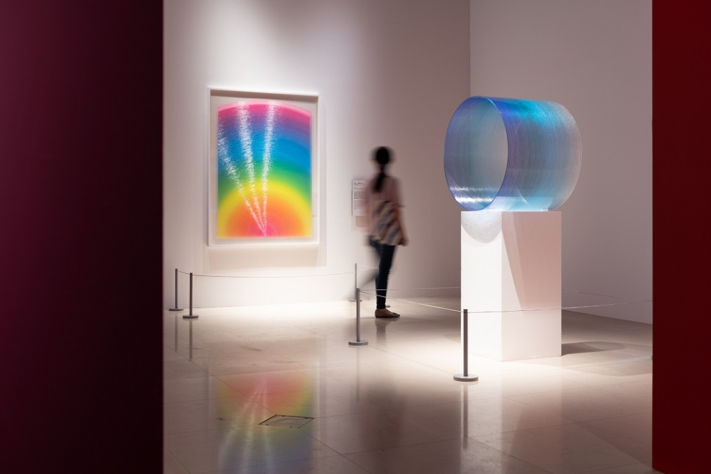 日本藝術家石川美奈子在透明壓克力板上使用壓克力顏料作畫,每條線等寬等距的精細創作,造就出優美和諧的藝術作品;日本金魚繪師深堀隆介運用壓克力樹脂技術,以分層繪畫的方式,堆疊出栩栩如生的立體金魚;透過展場的創作影片,可以看見他繁複的繪製過程。