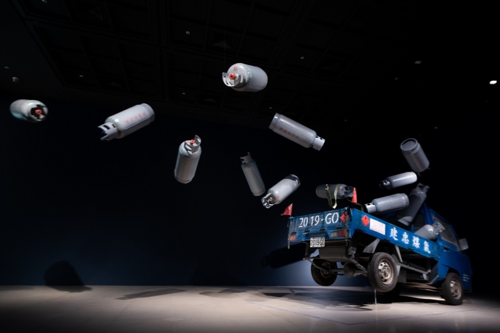 此外,臺灣藝術家廖建忠以複合媒材創作出一個有如劇場般、震懾人心的情境;一台小貨車與瓦斯桶飛躍空中,如同車禍現場的瞬間凝結,貨車的車窗內還能觀察到充滿生活感的細節,逼真程度令人驚嘆,超越了人們的既定認知。