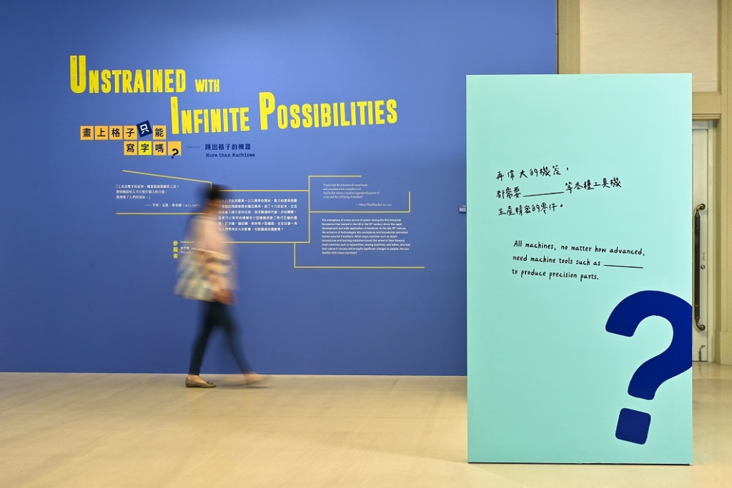 《跳出格子吧!》展覽規劃共分四大單元,第一單元「畫上格子就只能寫字嗎?」,首先介紹「三大跳出格子的機器」──打字機、縫紉機、車床。走入展場立刻看見三座「問號亭」,民眾可以透過問答與提示了解三大機器的重要性。