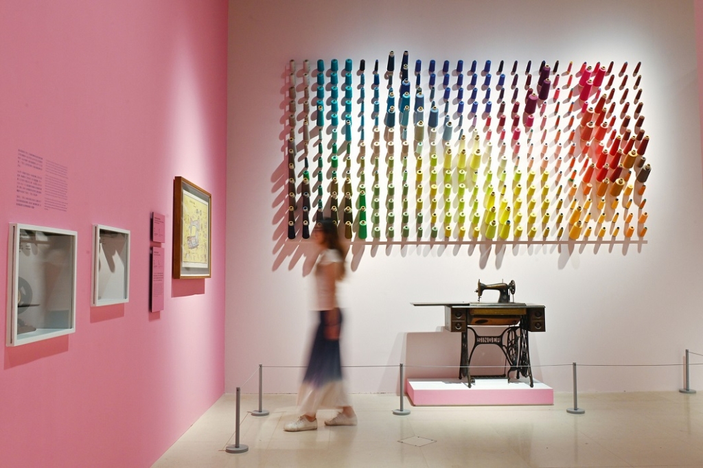 此次展覽設計別出心裁,不想對齊的歪斜線條、不肯站好的出框文字充斥整個展場,彷彿每個角落都想翻天覆地告訴大家不要懷疑、盡情突破框架!展場色彩也極具巧思,每區用色皆與展品相互呼應,例如許文龍展區,以藍色象徵他黑手出身的藍領階級;「打字機」展區則採粉紅色系,象徵它與女性經濟獨立的密切關聯,值得細細品味。此外,展場更打造多處充滿視覺張力的情境,包括大紅色的打字機視覺牆,彰顯它劃時代的重要意義;滿滿的線軸搭配縫紉機的擺設,勾起記憶中阿嬤家相似的景象;更有劇場般的交通事故場景,帶來強大的視覺衝擊!