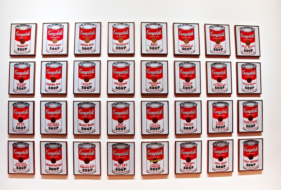 畫中圖案其實是美國「金寶湯公司(Campbell Soup Company)」所生產濃湯罐頭的「包裝」,每張畫皆有包裝上原本的商標及口味名稱。 畫作資料:安迪‧沃荷Andy Warhol|《金寶濃湯罐頭Campbell’s Soup Cans》|三十二幅帆布合成樹脂漆畫、絹印版畫| 每幅51 x 41公分|1962 年|美國紐約現代藝術博物館收藏。(攝影|Oscar_Anton)