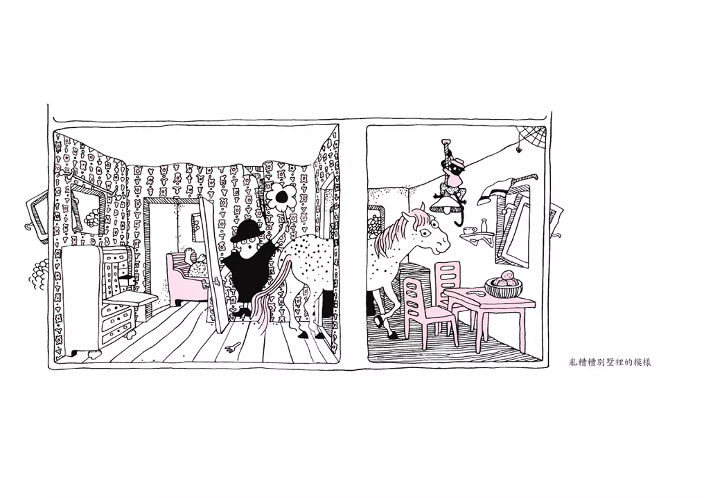 是以,與其說皮皮是個滿頭紅髮、長滿雀斑、年僅九歲的人類小女孩,她更像滿足兒童想像的具體化身:鬼靈精怪,是童話國度的魔法仙子、是超凡世界的怪物、是化外之地的小野獸;換言之,皮皮是超人,乃非人的後人類。本書中,皮皮確實不只一次展露上述形象。而書中皮皮幾乎去到學校的橋段,充分展現皮皮非此非彼、又此又彼的閾限(liminal)狀態。皮皮因想跟著學童去遠足,某日突然現身校園:那日是個晴暖天,教室窗戶全開,緊貼著教室牆外的樺樹上,有隻椋鳥棲息於樹梢快活啁啾。忽地,皮皮出現於樺樹的一根枝椏上;因為枝椏一直延伸到教室窗臺,所以皮皮又像是坐在窗戶前面。那麼皮皮究竟是人是鳥、是學童抑或輟學生,引人遐思、令人莞爾。