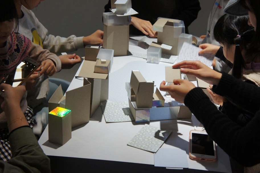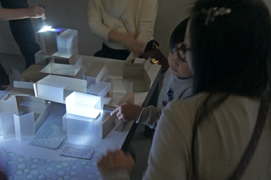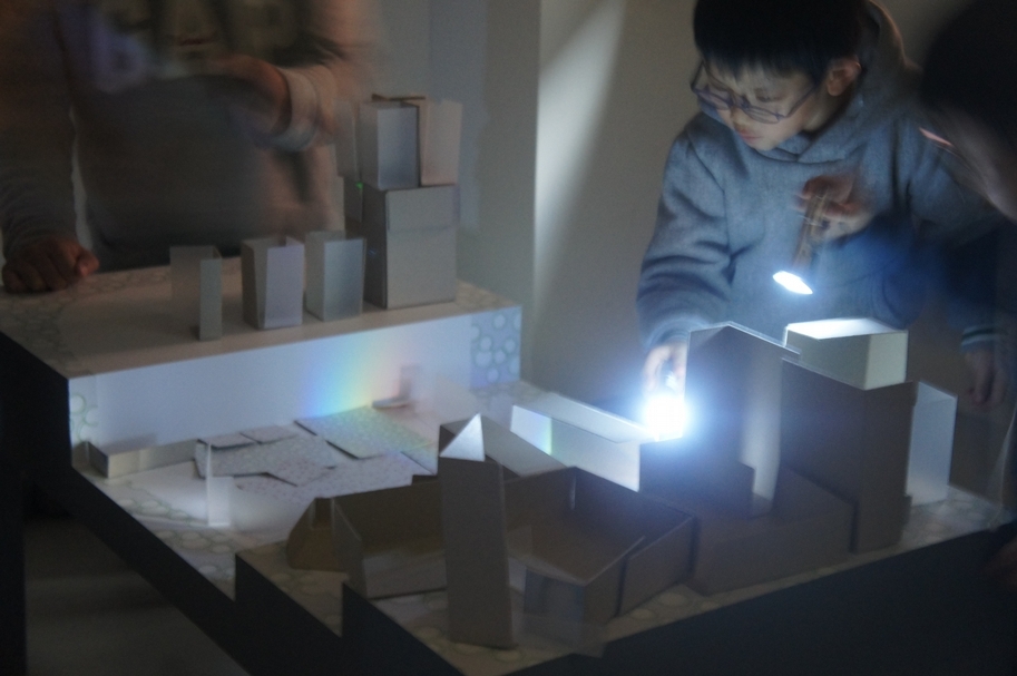 「房子」蓋好後,工作人員關燈,讓大家用手電筒照射觀察。當光照射在不同材質蓋的「房子」上,會產生什麼感覺跟效果呢?