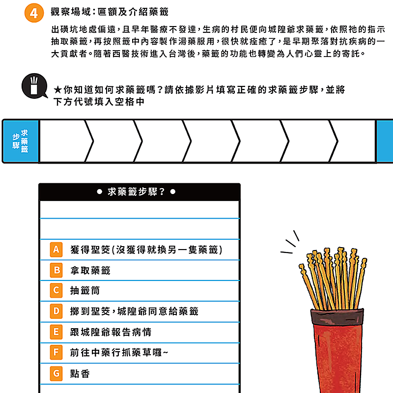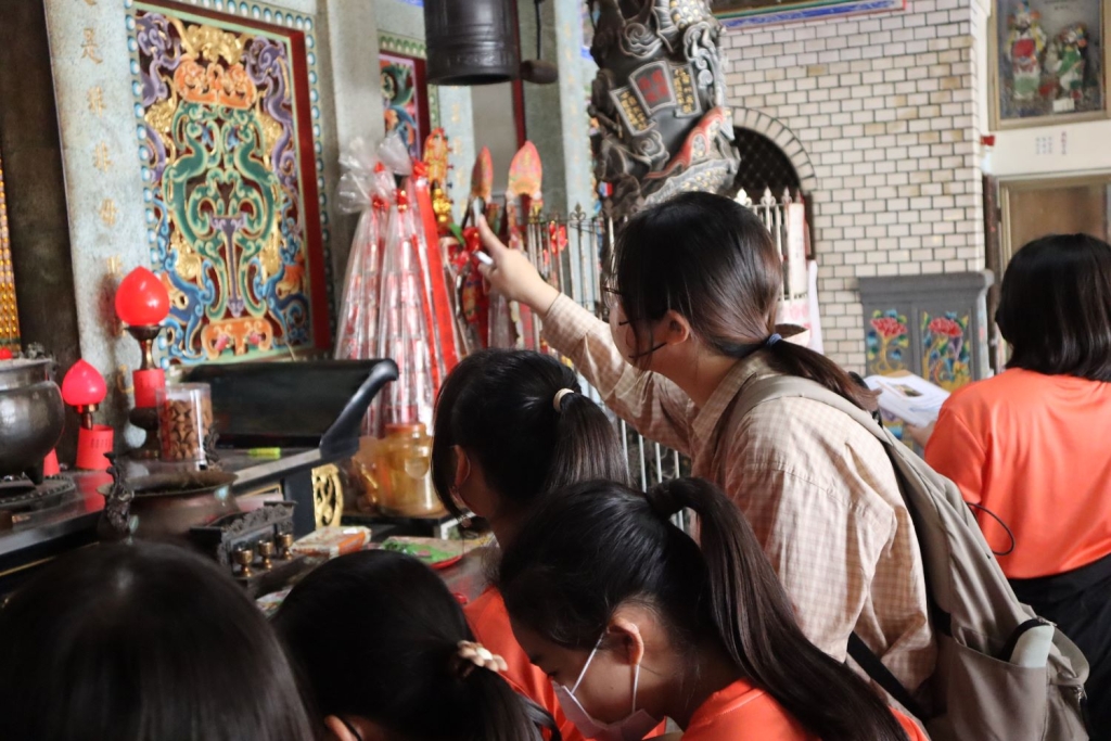 室外課程走入出磺坑聚落之中,從聚落信仰的中心─出磺坑城隍廟開始,介紹城隍爺的由來,以及出磺坑特有的藥籤文化,讓學生實際觀察廟宇的空間機能與其含義,並將觀察所得紀錄在學生手冊裡。